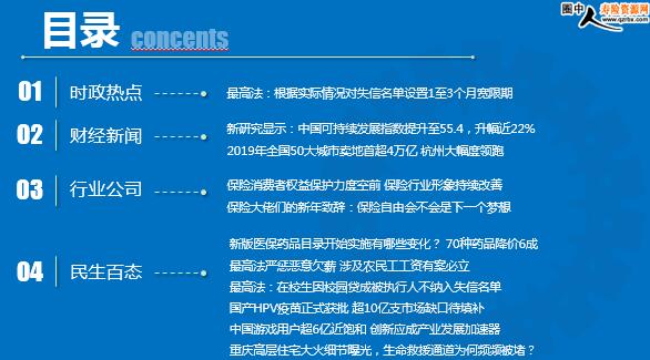 每日新闻速递2020年1月3日 星期五目录时政热点财经新闻行业公司民生百态最高法:根据实际情况对失信名单设置1至3个月宽限期新研究显示:中国可持续发展指数提升至55.4,升幅近22%2019年全国50大城市卖地首超4万亿 杭州大幅度领跑保险消费者权益保护力度空前 保险行业形象持续改善保险大佬们的新年致辞:保险自由会不会是下一个梦想新版医保药品目录开始实施有哪些变化? 70种药品降价6成最高法严惩恶意欠薪 涉及农民工工资有案必立最高法:在校生因校园贷成被执行人不纳入失信名单国产HPV疫苗正式获批 超10亿支市场缺口待填补中国游戏用户超6亿近饱和 创新应成产业发展加速器重庆高层住宅大火细节曝光,生命救援通道为何频频被堵?时政热点最高法:根据实际情况对失信名单设置1至3个月宽限期2020-1-2 10:32 来源:中新经纬最高人民法院(以下简称“最高法”)举行新闻发布会上,在发布会上,最高法发布的《关于在执行工作中进一步强化善意文明执行理念的意见》(以下简称《意见)指出,各地法院可以结合案件实际情况,对于决定采取惩戒措施的被执行人,可以给予其一至三个月的宽限期。最高人民法院审判委员会委员、执行局局长孟祥介绍,《意见)严格适用失信名单和限制消费措施。首先,在《意见》第14条重申人民法院必须严格按照相关司法解释规定的条件和程序采取这两项措施,在第16条明确不得采取惩戒措施的几类情形。其次,在《意见》第15条规定,各地法院可以结合案件实际情况,对于决定采取惩戒措施的被执行人,可以给予其一至三个月的宽限期,在宽限期内主动履行生效法律文书确定义务的,就不再采取惩戒措施;未履行的,再采取。财经新闻新研究显示:中国可持续发展指数提升至55.4,升幅近22%2020-1-2 10:50 来源:新华社中外学者1月1日在英国《自然》杂志发表报告说,他们使用新方法评估了中国完成17项联合国可持续发展目标的情况,结果显示中国的可持续发展水平在国家乃至省级层面都有明显提升。2015年9月,联合国通过以17个可持续发展目标为核心的2030年可持续发展议程,旨在消除贫困、消除饥饿、促进男女平等、应对气候变化、加强可持续发展全球伙伴关系。中国农业大学、美国密歇根州立大学等机构的研究人员基于联合国发布的文件和报告,构建了一个新的评估体系,用来衡量中国实现可持续发展的总体和各单项目标的完成情况。评估报告显示,2000年至2015年间,中国从国家层面到省级层面在落实可持续发展工作上成效显著。其中,国家层面的可持续发展指数从45.5提升至55.4,升幅近22%;省级层面的可持续发展指数平均值从42.2提升至54.9,升幅达30%。