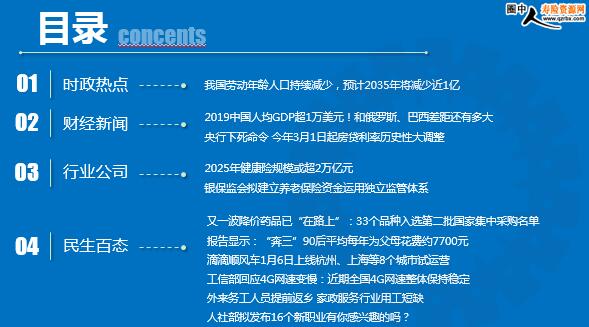 每日新闻速递2020年1月4日 星期六目录时政热点财经新闻行业公司民生百态我国劳动年龄人口持续减少,预计2035年将减少近1亿2019中国人均GDP超1万美元!和俄罗斯、巴西差距还有多大央行下死命令 今年3月1日起房贷利率历史性大调整2025年健康险规模或超2万亿元银保监会拟建立养老保险资金运用独立监管体系又一波降价药品已“在路上”:33个品种入选第二批国家集中采购名单报告显示:“奔三”90后平均每年为父母花费约7700元 滴滴顺风车1月6日上线杭州、上海等8个城市试运营工信部回应4G网速变慢:近期全国4G网速整体保持稳定外来务工人员提前返乡 家政服务行业用工短缺人社部拟发布16个新职业有你感兴趣的吗?时政热点我国劳动年龄人口持续减少,预计2035年将减少近1亿2020-01-03 00:05 来源:新京报人社部网站公布了该部党组在《求是》杂志上发表的署名文章《如何看待我国就业形势》。文章透露,我国16岁—59岁劳动年龄人口从2012年开始有所减少,这一趋势还将持续,到2020年后减幅将加快。预计到2035年劳动年龄人口将保持在8亿人左右,这比2018年末的近9亿劳动年龄人口减少将近1亿人。文章指出,从总量看,就业压力依然存在。但这种减少是供给高位上的放缓,而且由于受教育等因素影响,劳动年龄人口进入劳动力市场的时间相对滞后。2018年末我国劳动年龄人口仍接近9亿人,预计到2035年劳动年龄人口将保持在8亿人左右。近几年,每年需要在城镇就业的新成长劳动力约有1500多万人,加上近千万的城镇登记失业人员,需在城镇就业的劳动力年均约2500万人。不仅如此,推进城镇化进程中,农村劳动力转移就业仍有增量。财经新闻2019中国人均GDP超1万美元!和俄罗斯、巴西差距还有多大2020-1-3 10:32 来源:瞭望智库2019年2月国家统计局公布的数据显示,2018年中国人均GDP达9732美元,比2017年的8836美元增长了10.1%,已接近1万美元的门槛。预计2019年中国人均GDP应该会稳稳地超过1万美元。那么,人均GDP达到1万美元的国家,经济发展与国民生活是什么状态?人均GDP在1万美元左右的小国有毛里求斯、多米尼加、格林纳达、赤道几内亚等。这些国家人口少则十几万,多的也不过上千万,没有太大的借鉴意义。真正值得研究的是20国集团(G20)。G20是19个国家加欧盟,在世界经济中地位突出。