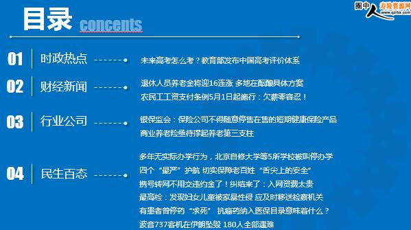 每日新闻速递 2020年1月9日 星期四 目录 时政热点 财经新闻 行业公司 民生百态 未来高考怎么考?教育部发布中国高考评价体系 退休人员养老金将迎16连涨 多地在酝酿具体方案 农民工工资支付条例5月1日起施行:欠薪零容忍! 银保监会:保险公司不得随意停售在售的短期健康保险产品 商业养老险亟待撑起养老第三支柱 多年无实际办学行为,北京自修大学等5所学校被叫停办学 四个“最严”护航 切实保障老百姓“舌尖上的安全” 携号转网不用交违约金了!纠结来了:入网资费太贵 最高检:发现妇女儿童被家暴性侵 应及时移送检察机关 有患者曾停药“求死” 抗癌药纳入医保目录意味着什么? 波音737客机在伊朗坠毁 180人全部遇难 时政热点 未来高考怎么考?教育部发布中国高考评价体系 2020-01-08 08:31:25 来源:中国新闻网 日前,教育部考试中心发布了《中国高考评价体系》,评价体系由“一核”“四层”“四翼”组成。教育部介绍,考查要求上,高考评价体系突出基础性、综合性、应用性、创新性,促进高中教学方式改革,助力发展素质教育。例如,高考通过开放性、探究性情境的设计,加强学生创新意识和创新思维能力的考查和培养。高考评价体系的科学构建,是发挥高考正向指挥棒作用、完善立德树人体制机制的重要举措。高考评价体系创造性地将立德树人根本任务融入考试评价全过程,以实现高考评价目标与素质教育目标的内在统一,切实将高考打造成为立德树人的重要载体和素质教育的关键环节,成为德智体美劳全面培养教育体系的有机组成部分。 财经新闻 退休人员养老金将迎16连涨 多地在酝酿具体方案 2020-01-08 11:29 来源: 经济日报 2020年伊始,新一轮养老金上调窗口再度开启。《经济参考报》记者获悉,退休人员养老金将迎来16连涨,城乡居民养老金有望继续上调,多地已在酝酿具体方案。与此同时,2020年养老保险制度改革也迎来关键年,多层次养老保险体系构建再谋新突破,多项重磅举措蓄势待发。据悉,基本养老保险制度改革正在紧锣密鼓地谋划中,养老金合理调整机制、职业年金投资管理办法或加速出炉。2020年年内将继续上调养老保险基金中央调剂比例,养老金省级统筹、城乡居民养老金投资将全面收官,备受关注的“第三支柱”——个人养老金制度步入全面发力期。继2019年我国退休人员养老金上涨5%之后,2020年城镇企业和机关事业单位职工退休人员养老金将迎来16连涨,养老金上调方案已在酝酿,或于近期加快出台。