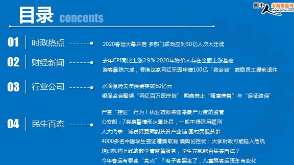 每日新闻速递 2020年1月11日 星期六 目录 时政热点 财经新闻 行业公司 民生百态 2020春运大幕开启 多部门联动应对30亿人次大迁徙 去年CPI同比上涨2.9% 2020年物价不存在全面上涨基础 游客暴跌六成,香港这家网红乐园申请100亿“救命钱”鼓励员工提前退休 水滴保险去年保费突破60亿元 银保监会整顿“网红百万医疗险” 明确禁止“随意停售”与“保证续保” 严查“挂证”行为!执业药师将迎来最严力度的监管 公安部:7类袭警情形从重处罚,一般不得适用缓刑 人大代表:减税降费赋能扶贫产业链 圆村民脱贫梦 4000多名中国学生签证遭澳取消 澳舆论担忧:大学财政可能陷入危机 培训机构上线助教学管监督服务,学生花钱能否买来自律? 今年春运有哪些“亮点”?电子客票来了,儿童乘客运班车有变化 时政热点 2020春运大幕开启 多部门联动应对30亿人次大迁徙 2020-01-10 07:15 来源:中新网 今天起,2020年春运大幕正式开启。40天时间里,预计全国旅客发送量将达到约30亿人次。为应对一年一度的“大迁徙”,多部门协调联动,从加大运力供给、提升旅客服务品质、加强安全管理等方面入手,为春运保驾护航。2020年春运,交通运输部也将充分利用大数据等技术手段,结合春运历史数据,做好春运客流趋势、出行特点的研判分析,进一步优化道路运力调配,科学安排班次计划,充分挖掘运输潜力,切实提升运输供给能力。交通运输部还强调,要加大客运枢纽、火车站、渡口码头、机场、旅游景区景点等重点区域运力投放,切实提高旅客集疏运能力。 财经新闻 去年CPI同比上涨2.9% 2020年物价不存在全面上涨基础 2020-01-10 07:50 来源:经济日报 尽管2019年物价涨幅调控面临多重困难和压力,但随着一系列政策举措的实施,国内物价整体向好的方向发展。专家认为,下一阶段应加强市场运行分析、趋势研判和预测预警,做好重要时段重点商品供给保障,努力实现物价平稳运行,为宏观调控提供有利空间。2020年,宏观政策将以稳为主,在扩需求、稳增长、稳就业上发挥更大作用,物价有望保持平稳运行——1月9日,国家统计局发布了2019年12月份全国居民消费价格指数(CPI)和工业生产者出厂价格指数(PPI)。数据显示,12月份CPI同比上涨4.5%,同比涨幅与上个月持平;PPI同比下跌0.5%,环比持平。