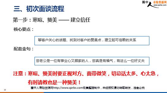 专业化销售流程训练—— 初次面谈 课程大纲 1.初次面谈的目的 2.初次面谈前的准备 3.初次面谈的流程 4.初次面谈的示范 初次面谈时客户的反应探讨 卖杯子的游戏 请将杯子卖给你想卖的人 讨论: 在刚刚的销售过程中, 哪一个环节是最重要的? 需要 想要 你无法强迫马喝水,但你可以让马感到口渴 课程大纲 1.初次面谈的目的 2.初次面谈前的准备 3.初次面谈的流程 4.初次面谈的示范 因为人情,才会见面 因为专业,才会购买 课程大纲 1.初次面谈的目的 2.初次面谈前的准备 3.初次面谈的流程 4.初次面谈的示范 二、初次面谈前准备——心态准备 走出课堂后你会向谁销售保险? 销售前你会有顾虑吗? 二、初次面谈前准备——心态准备 明确几点: 二、初次面谈前准备——形象准备 你永远没有第二次机会 去创造良好的第一印象! 二、初次面谈前准备——形象准备