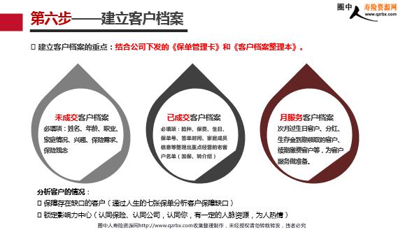 保险客户名单整理六步走 第二步——辅导面谈 主管与辖下组员一对一沟通面谈; 针对个别不配合者,由总监本人亲自沟通; 第三步——工具准备 在主管对属员进行面谈达成共识后,提前一天提醒携带:手机,通讯录,名片,毕业照,留言册,《客户100》工具表, 《保单管理卡》, 《客户档案整理本》等用于次日的列名单活动。 再次在二早提醒并监督团队伙伴提前准备列名单工具,确保100个名单数量。 第五步——名单分类 保险观念:很好 保险观念:一般 经济条件:很好 经济条件:一般