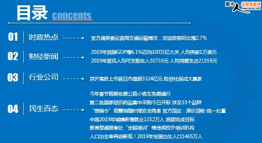 每日新闻速递 2020年1月18日 星期六 目录 时政热点 财经新闻 行业公司 民生百态 官方通报春运首周交通运输情况:发送旅客同比增2.7% 2019年我国GDP增6.1%迈向100万亿大关 人均突破1万美元 2019年居民人均可支配收入30733元 人均消费支出21559元 保险行业:新会计准则逐步实施 考验保险公司配置能力 京沪高铁上市首日市值超3324亿元 险资社保成大赢家 今年春节假期收费公路小客车免费通行 第二批国家组织药品集中采购今日开标 涉及33个品种 “禁炮令”致鞭炮囤积埋安全隐患 官方回应:原价回收 统一处置 中国2019年城镇新增就业1352万人 超额完成目标 教育部通报查处“全脑培训”等违规校外培训机构 人口出生率再创新低!2019年全国出生人口1465万人 时政热点 官方通报春运首周交通运输情况:发送旅客同比增2.7% 2020-01-17 08:59 来源:中新经纬 交通运输部17日召开新闻发布会,交通运输部新闻发言人吴春耕介绍,春运首周,全国春运工作运行情况总体平稳有序。全国铁路、道路、水路、民航共累计发送旅客4.37亿人次,比去年同期增长2.7%。吴春耕称,1月10日春运启动以来,交通运输部全力打造平安春运、便捷春运、温馨春运、诚信春运、绿色春运,努力保障人民群众安全便捷出行。截至目前,全国春运工作运行情况总体平稳有序。吴春耕同时表示,综合对春运一周以来的情况监测和预测分析,今年春运呈现以下特点:首先客运结构不断优化。春运首周(1月10日至16日),全国铁路、道路、水路、民航共累计发送旅客4.37亿人次,比去年同期增长2.7%。其中铁路发送旅客6982.6万人次,增长21.8%;道路发送旅客3.51亿人次,下降0.6%;水路发送旅客493.2万人次,增长4.4%;民航发送旅客1121万人次,增长7.1%。高铁、民航、水运出行量增加,道路客运量下降。 财经新闻 2019年我国GDP增6.1%迈向100万亿大关 人均突破1万美元 2020年01月17日 07:26 来源:人民日报 国家统计局1月17日对外公布,经初步核算,2019年全年我国国内生产总值(GDP)为99.0865万亿元,稳居世界第二位,按可比价格计算,比上年增长6.1%,符合6%至6.5%的预期目标。分季度看,一季度同比增长6.4%,二季度增长6.2%,三季度增长6.0%,四季度增长6.0%。国家统计局数据显示,此前,全球人均GDP超过1万美元的经济体总人口近15亿。中国人均GDP突破1万美元,相当于人均GDP超过1万美元的世界人口翻了一番。国家统计局局长宁吉喆表示,经济规模的提升,意味着人民收入增加、生活更加殷实,更是人类历史上的重大进步。