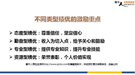有话好好说 ——绩优沟通的技巧 通过本堂课程的学习,使学员学会分析绩优的特质,找出与绩优沟通的注意事项,通过有效沟通助力绩优的成长。 课程目的 目录/Contents 与绩优沟通的意义 PART 1 (一)对内勤 增进与绩优的感情提升自身的技能和工作效率助推机构业务平台 (二)对外勤 绩优的特质及沟通注意事项 PART 2 讨论: 绩优人员有什么样的特质? 1、优点 强烈的荣誉感明确的目标性高度的敬业精神 较强的客户经营意识优秀的专业技能 (一)绩优人员的特质 相对自我,欠缺大局观个性较强,有自己的性格寻找沟通点较难 2、不足 (二)沟通注意事项 内外勤交流的基本准则高绩优的性格特点高绩优的心理状态 1 、尊重与信任为基础