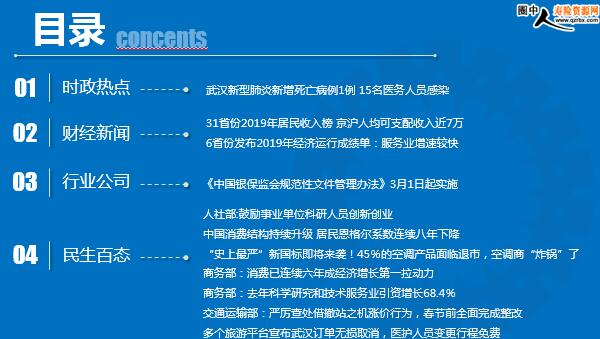 每日新闻速递 2020年1月22日 星期三 目录 时政热点 财经新闻 行业公司 民生百态 武汉新型肺炎新增死亡病例1例 15名医务人员感染 31省份2019年居民收入榜 京沪人均可支配收入近7万 6省份发布2019年经济运行成绩单:服务业增速较快 《中国银保监会规范性文件管理办法》3月1日起实施 人社部:鼓励事业单位科研人员创新创业 中国消费结构持续升级 居民恩格尔系数连续八年下降 “史上最严”新国标即将来袭!45%的空调产品面临退市,空调商“炸锅”了 商务部:消费已连续六年成经济增长第一拉动力 商务部:去年科学研究和技术服务业引资增长68.4% 交通运输部:严厉查处借撤站之机涨价行为,春节前全面完成整改 多个旅游平台宣布武汉订单无损取消,医护人员变更行程免费 时政热点 武汉新型肺炎新增死亡病例1例 15名医务人员感染 2020-01-21 07:15 来源:人民日报 2020年1月19日22时—1月19日24时,死亡1例,无出院病例和新增病例。死者陈某,男,89岁,2020年1月13日发病,1月18日因严重呼吸困难入院救治,1月19日23:39抢救无效死亡。患者有高血压、糖尿病、冠心病、频发室性早搏等基础疾病。截至1月19日24时,我市累计报告新型冠状病毒感染的肺炎病例198例,已治愈出院25例,死亡4例。目前仍在院治疗169例,其中重症35例、危重症9例,均在武汉市定点医疗机构接受隔离治疗。目前,我市共有15名医务人员确诊为新型冠状病毒感染的肺炎病例,另有1名为疑似病例。16例患者中,危重症1例,其余病情稳定,均已隔离治疗。医务人员是疫情防控的主力军。为确保医务人员健康,近日,我市就加强各类医院的防控措施,严格控制医院感染,强化医务人员防护,关心关爱医护人员等方面再次进行部署,加强对医务人员健康的日常监测,对疑似病例及时进行检测和救治。 财经新闻 31省份2019年居民收入榜 京沪人均可支配收入近7万 2020-01-21 10:27 来源:中新网 国家统计局近日公布了31省份2019年居民人均可支配收入数据。上海以69442元高居榜首,逼近7万元大关。北京以67756元位居第二名。上海人、北京人能挣能花,其居民人均消费支出超过4万元,同样位居前两名。国家统计局数据显示,2019年全国居民人均可支配收入30733元,扣除价格因素实际增长5.8%,与经济增长基本同步,与人均GDP增长大体持平。也就是说,全国居民人均可支配收入首次突破3万元大关。居民可支配收入,指居民可用于最终消费支出和储蓄的总和,即居民可用于自由支配的收入,既包括现金收入,也包括实物收入。从各地的居民人均可支配收入数据来看,上海、北京、浙江、天津、江苏、广东、福建、辽宁、山东这9个省份2019年居民人均可支配收入超过了全国水平。