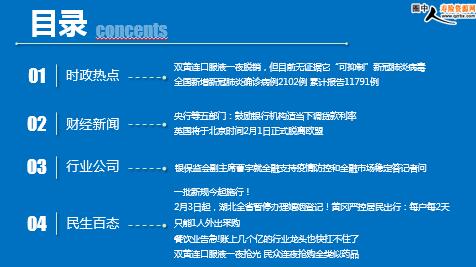 每日新闻速递 2020年2月2日 星期日 目录 时政热点 财经新闻 行业公司 民生百态 双黄连口服液一夜脱销,但目前无证据它“可抑制”新冠肺炎病毒 全国新增新冠肺炎确诊病例2102例 累计报告11791例 央行等五部门:鼓励银行机构适当下调贷款利率 英国将于北京时间2月1日正式脱离欧盟 银保监会副主席曹宇就金融支持疫情防控和金融市场稳定答记者问 一批新规今起施行! 2月3日起,湖北全省暂停办理婚姻登记!黄冈严控居民出行:每户每2天只能1人外出采购 餐饮业告急!账上几个亿的行业龙头也快扛不住了 双黄连口服液一夜抢光 民众连夜抢购金类似药品 时政热点 双黄连口服液一夜脱销,但目前无证据它“可抑制”新冠肺炎病毒 2020-02-01 15:18:52 来源: 央视新闻 1月31日,有媒体报道中科院上海药物所和武汉病毒所联合研究初步发现,中成药双黄连口服液可抑制新型冠状病毒。 据新华视点信息,该项研究由上海药物所蒋华良院士牵头的抗新型冠状病毒感染肺炎药物研究应急攻关团队,在前期SARS相关研究和药物发现成果基础上,聚焦针对该病毒的治疗候选新药筛选、评价和老药新用研究。 但是,需要指出的是,世界卫生组织此前明确,目前对于新型冠状病毒所致疾病没有特异治疗方法,也没有可用疫苗。 目前双黄连口服液已在上海公共卫生临床中心、华中科技大学附属同济医院开展临床研究。按照科学规律,证实药物真实有效通常要经过动物实验和I、II、III期临床试验,才能明确药物安全有效。 全国新增新冠肺炎确诊病例2102例 累计报告11791例 2020-02-01 07:59:20 来源: 中华人民共和国国家卫生健康委员会 1月31日0—24时,31个省(自治区、直辖市)和新疆生产建设兵团报告新增确诊病例2102例,新增重症病例268例,新增死亡病例46例(湖北省45例、重庆市1例),新增治愈出院病例72例,新增疑似病例5019例。 截至1月31日24时,国家卫生健康委收到31个省(自治区、直辖市)和新疆生产建设兵团累计报告确诊病例11791例(江西省、陕西省、甘肃省各核减1例),现有重症病例1795例,累计死亡病例259例,累计治愈出院病例243例,共有疑似病例17988例。 目前累计追踪到密切接触者136987人,当日解除医学观察6509人,共有118478人正在接受医学观察。累计收到港澳台地区通报确诊病例30例:香港特别行政区13例,澳门特别行政区7例,台湾地区10例。