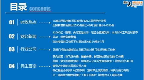 每日新闻速递 2020年2月3日 星期一 目录 时政热点 财经新闻 行业公司 民生百态 火神山医院挂牌 军队抽组1400人承担医疗任务 全国新增新冠肺炎2590例死亡45例 累计确诊14380例 12000亿!刚刚,央行紧急出手!证监会重磅发声:出台对冲工具应对股市异动,保持高度警惕防控疫情进口物资不对美加征关税 为期3个月 四部门:各类金融机构3日起正常上班 可实行弹性工作制 研究发现:除飞沫传播、接触传播,新冠肺炎还存在粪-口传播 美国、意大利相继宣布:国家进入公共卫生紧急状态!美禁止近14日内曾到访中国的非美国公民入境 韩红基金会收到1.4亿捐款后,宣布停止接受捐款,称执行能力有限 又一部院线片撤档网播了!甄子丹新片《肥龙过江》超前点映 时政热点 火神山医院挂牌 军队抽组1400人承担医疗任务 2020年02月02日 12:37 来源:看看新闻 2日上午,武汉火神山医院正式挂牌。据悉,军队抽组1400名医护人员于2月3日起承担武汉火神山新型冠状病毒感染肺炎专科医院医疗救治任务。该医院主要救治确诊患者,编设床位1000张,开设重症监护病区、重症病区、普通病区,设置感染控制、检验、特诊、放射诊断等辅助科室。据了解,医护人员中有不少人曾参加小汤山医院抗击非典任务以及援助塞拉利昂、利比里亚抗击埃博拉疫情任务,具有丰富的传染病救治经验。 全国新增新冠肺炎2590例死亡45例 累计确诊14380例 2020-02-02 07:50:33 来源: 健康中国 2月1日0—24时,31个省(自治区、直辖市)和新疆生产建设兵团报告新增确诊病例2590例(湖北省1921例),新增重症病例315例(湖北省268例),新增死亡病例45例(湖北省45例),新增治愈出院病例85例(湖北省49例),新增疑似病例4562例(湖北省2606例)。 截至2月1日24时,国家卫生健康委收到31个省(自治区、直辖市)和新疆生产建设兵团累计报告确诊病例14380例,现有重症病例2110例,累计死亡病例304例,累计治愈出院病例328例,共有疑似病例19544例。目前累计追踪到密切接触者163844人,当日解除医学观察8044人,共有137594人正在接受医学观察。 累计收到港澳台地区通报确诊病例31例:香港特别行政区14例,澳门特别行政区7例,台湾地区10例。