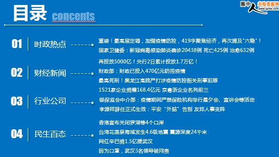 每日新闻速递 2020年2月5日 星期三 目录 时政热点 财经新闻 行业公司 民生百态 重磅!最高层定调,加强疫情防控,419字聚焦经济,再次提及"六稳"! 国家卫健委:新冠病毒感染肺炎确诊20438例 死亡425例 治愈632例 再投放5000亿!央行2日累计投放1.7万亿! 财政部:财政已投入470亿元防控疫情 最高死刑!黑龙江高院严打涉疫情防控相关刑事犯罪 1521家企业捐赠168.4亿元 京粤浙企业名列前三 银保监会中介部:疫情期间严禁保险机构举行晨夕会、宣讲会等活动 李源祥辞任正式生效:平安“外脑”告别 友邦人事变阵 香港宣布关闭罗湖等4个口岸 台湾花莲县海域发生4.6级地震 震源深度24千米 网红辛巴捐1.5亿援武汉 因为口罩,武汉3名领导被问责 时政热点 重磅!最高层定调,加强疫情防控,419字聚焦经济,再次提及"六稳"! 2020年02月03日 12:37 来源:央视新闻 据新华社报道,中共中央政治局常务委员会2月3日召开会议,听取中央应对新型冠状病毒感染肺炎疫情工作领导小组和有关部门关于疫情防控工作情况的汇报,研究下一步疫情防控工作。中共中央总书记习近平主持会议并发表重要讲话。 会上,最高层就加强疫情防控工作提出了9大要点。其中,有419字专门涉及到疫情防控阶段的经济发展和困难应对,并再度重点提及“六稳”,也即稳就业、稳金融、稳外贸、稳投资、稳预期。 国家卫健委:新冠病毒感染肺炎确诊20438例 死亡425例 治愈632例 2020-02-04 08:50:33 来源:经济观察报 经济观察网讯截至2月3日24时,国家卫生健康委收到31个省(自治区、直辖市)和新疆生产建设兵团累计报告确诊病例20438例(黑龙江省核减2例),现有重症病例2788例,累计死亡病例425例,累计治愈出院病例632例,现有疑似病例23214例。 目前累计追踪到密切接触者221015人,当日解除医学观察12755人,现有171329人正在接受医学观察。 累计收到港澳台地区通报确诊病例33例:香港特别行政区15例,澳门特别行政区8例,台湾地区10例。