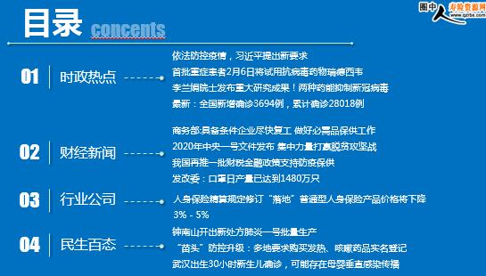 每日新闻速递 2020年2月7日 星期五 目录 时政热点 财经新闻 行业公司 民生百态 依法防控疫情,习近平提出新要求 首批重症患者2月6日将试用抗病毒药物瑞德西韦 李兰娟院士发布重大研究成果!两种药能抑制新冠病毒 最新:全国新增确诊3694例,累计确诊28018例 商务部:具备条件企业尽快复工 做好必需品保供工作 2020年中央一号文件发布 集中力量打赢脱贫攻坚战 我国再推一批财税金融政策支持防疫保供 发改委:口罩日产量已达到1480万只 人身保险精算规定修订“落地”普通型人身保险产品价格将下降3%-5% 钟南山开出新处方肺炎一号批量生产 “苗头”防控升级:多地要求购买发热、咳嗽药品实名登记 武汉出生30小时新生儿确诊,可能存在母婴垂直感染传播 时政热点 依法防控疫情,习近平提出新要求 2020-02-05 16:59:00 来源:人民网 中共中央总书记、国家主席、中央军委主席、中央全面依法治国委员会主任习近平2月5日下午主持召开中央全面依法治国委员会第三次会议并发表重要讲话。他强调,要在党中央集中统一领导下,始终把人民群众生命安全和身体健康放在第一位,从立法、执法、司法、守法各环节发力,全面提高依法防控、依法治理能力,为疫情防控工作提供有力法治保障。 习近平在讲话中强调,当前,疫情防控正处于关键时期,依法科学有序防控至关重要。疫情防控越是到最吃劲的时候,越要坚持依法防控,在法治轨道上统筹推进各项防控工作,保障疫情防控工作顺利开展。 首批重症患者2月6日将试用抗病毒药物瑞德西韦 2020-02-06 00:22:31 来源:环球时报 目前,在科技部、国家卫健委、国家药监局等多部门支持下,抗病毒药物瑞德西韦(remdesivir)已完成临床试验的注册审批工作,第一批病例入组工作也已就位。首批新型冠状病毒感染的肺炎重症患者2月6日将接受用药。