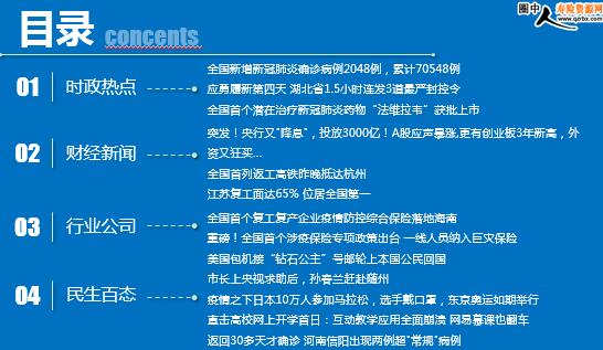 每日新闻速递 2020年2月18日 星期二 目录 时政热点 财经新闻 行业公司 民生百态 全国新增新冠肺炎确诊病例2048例,累计70548例 应勇履新第四天 湖北省1.5小时连发3道最严封控令 全国首个潜在治疗新冠肺炎药物“法维拉韦”获批上市 突发!央行又"降息",投放3000亿!A股应声暴涨,更有创业板3年新高,外资又狂买… 全国首列返工高铁昨晚抵达杭州 江苏复工面达65% 位居全国第一 全国首个复工复产企业疫情防控综合保险落地海南 重磅!全国首个涉疫保险专项政策出台 一线人员纳入巨灾保险 美国包机接“钻石公主”号邮轮上本国公民回国 市长上央视求助后,孙春兰赶赴随州 疫情之下日本10万人参加马拉松,选手戴口罩,东京奥运如期举行 直击高校网上开学首日:互动教学应用全面崩溃 网易慕课也翻车 返回30多天才确诊 河南信阳出现两例超"常规"病例 时政热点 全国新增新冠肺炎确诊病例2048例,累计70548例 2020-02-17 08:42 来源:成都商报社 截至2月16日24时,据31个省(自治区、直辖市)和新疆生产建设兵团报告,现有确诊病例57934例(其中重症病例10644例),累计治愈出院病例10844例,累计死亡病例1770例,累计报告确诊病例70548例,现有疑似病例7264例。累计追踪到密切接触者546016人,尚在医学观察的密切接触者150539人。 累计收到港澳台地区通报确诊病例87例:香港特别行政区57例(出院2例,死亡1例),澳门特别行政区10例(出院5例),台湾地区20例(出院2例,死亡1例)。 应勇履新第四天 湖北省1.5小时连发3道最严封控令 2020年02月17日05:42 来源:南方都市报 16日下午,一个半小时内,湖北省连发三道关于城乡社区、村组封闭管理措施的重磅通知。湖北省人民政府网显示,《湖北省人民政府关于进一步强化新冠肺炎疫情防控的通告》于15:46发布,随后湖北省新型冠状病毒感染肺炎疫情防控指挥部分别于16:57分布了《关于加强城市社区、小区封闭管理工作的通知》,17:12发布了《关于加强农村村组封闭管理工作的通知》。