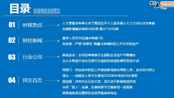 每日新闻速递 2020年2月19日 星期三 目录 时政热点 财经新闻 行业公司 民生百态 人大常委会将审议关于推迟召开十三届全国人大三次会议决定草案 全国新增确诊病例1886例 累计72436例 离岸人民币18日盘中跌破7元 财政部:严禁"搭便车"购置与疫情防控工作无关的资产 银保监会:去年四季度银行业保险业总资产平稳增长 光大永明资产成功注册行业首批抗疫保险债权投资计划 两部门:符合条件的因工作感染新冠肺炎殉职人员,应评定为烈士 湖北:一线医务人员子女参加2020年中考加10分录取 国资委:涉药央企正在北京、武汉进行新冠疫苗研发 共同“敌人”来袭,印度将联手巴基斯坦一起抵御 阿联酋批准运营阿拉伯世界首座核电站 时政热点 人大常委会将审议关于推迟召开十三届全国人大三次会议决定草案 2020-02-17 15:57 来源:新浪财经 近期以来,湖北省武汉等地陆续发生新型冠状病毒感染肺炎的疫情。 基于上述考虑,常委会工作机构拟订了关于推迟召开十三届全国人大三次会议的决定草案。17日召开的委员长会议决定,十三届全国人大常委会第十六次会议2月24日在北京举行,其中一项议程是审议委员长会议关于提请审议《全国人民代表大会常务委员会关于推迟召开第十三届全国人民代表大会第三次会议的决定(草案)》。同时,全国人大常委会正在为积极修改与疫情防控相关的法律做好各项准备工作。 全国新增确诊病例1886例 累计72436例 2020-02-18 08:42 来源:北京日报 截至2月17日24时,据31个省(自治区、直辖市)和新疆生产建设兵团报告,现有确诊病例58016例(其中重症病例11741例),累计治愈出院病例12552例(北京核增7例),累计死亡病例1868例,累计报告确诊病例72436例(新疆生产建设兵团核增2例),现有疑似病例6242例。累计追踪到密切接触者560901人,尚在医学观察的密切接触者141552人。 累计收到港澳台地区通报确诊病例92例:香港特别行政区60例(出院2例,死亡1例),澳门特别行政区10例(出院5例),台湾地区22例(出院2例,死亡1例)。