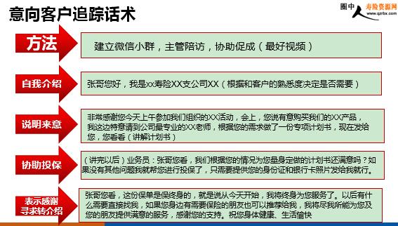 微产会 会后追踪及促成要领 会后追踪的重要性 提升业绩增强信心 回访答谢跟进感情 借机获取转介绍(业绩/增员) 为再次邀约做好准备 追踪时间及方式 会后追踪客户分类 活跃客户树立信心、调整心态、索取转介绍。 有意向客户递送专项计划书、进一步促成、协助投保。 未到会客户将会场情况与客户沟通,做好下次预约 到会但无互动的客户树立信心、调整心态、索取转介绍。 会后追踪内容 一对一回访 追踪方法 回访内容 调查客户参会感受递送计划书再次促成协助投保寻求转介绍 “xx寿险管家”APP安装推广 追踪要点 递送专项计划书,详细讲解,从“利他”角度出发,告诉他享有的权益和获得的保障。无论客户买不买,都要给客户留下好印象,重视他,让他记住你。说考虑的,要另选时间在追踪一次,不要轻易放弃。不要问客户“在忙吗”“有时间吗”等问题,直入主题。加深平时的联络,不为签单,增进感情,让客户记住你,今后有需要第一时间想到你。把握好联络的节奏,切忌,不要让客户反感。 一对一追踪:由主管或展业高手进行视频陪访 意向客户追踪话术 方法 建立微信小群,主管陪访,协助促成(最好视频) 自我介绍 张哥您好,我是xx寿险XX支公司XX(根据和客户的熟悉度决定是否需要)