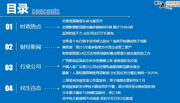 每日新闻速递 2020年2月22日 星期六 目录 时政热点 财经新闻 行业公司 民生百态 河南省原副省长徐光被双开 全国新增新冠肺炎确诊病例889例 累计75465例 监狱防疫不力 山东司法厅厅长被免 世界首个央行数字货币呼之欲出?瑞典开始测试电子克朗 商务部:预计2月底多数地方外资企业复工复产 财政部预拨14亿元支持各地做好蝗虫等重大病虫害防控工作 广西银保监局赵汝林涉受贿被公诉 被批搞权色交易 中国人寿广东省分公司总经理陈盛银因新冠肺炎离世 最新!人身险精算制度再迎新规 分红险红利分配比例统一为70% 上海首例涉疫妨害公务案宣判,男子堵路伤警获刑8个月 新冠疫苗研发5种技术路线同步开展,部分项目至动物试验阶段 日本累计确诊728例新冠肺炎,死亡3例 华中科大教授柯卉兵病逝 该校半月已失5位教授 时政热点 河南省原副省长徐光被双开 2020-02-21 15:02 来源:海外网 日前,经中共中央批准,中央纪委国家监委对河南省政府原党组成员、副省长徐光严重违纪违法问题进行了立案审查调查。 经查,徐光严重违反党的政治纪律、组织纪律、廉洁纪律和生活纪律,构成严重职务违法并涉嫌受贿犯罪,且在党的十八大后不收敛、不收手,对任职地区的政治生态造成恶劣影响,应予严肃处理。依据《中国共产党纪律处分条例》《中华人民共和国监察法》等有关规定,经中央纪委常委会会议研究并报中共中央批准,决定给予徐光开除党籍处分;由国家监委给予其开除公职处分;终止其河南省第十次党代会代表资格;收缴其违纪违法所得;将其涉嫌犯罪问题移送检察机关依法审查起诉,所涉财物随案移送。 全国新增新冠肺炎确诊病例889例 累计75465例 2020-02-21 09:42 来源:新京报 截至2月20日24时,据31个省(自治区、直辖市)和新疆生产建设兵团报告,现有确诊病例54965例(其中重症病例11633例),累计治愈出院病例18264例,累计死亡病例2236例,累计报告确诊病例75465例,现有疑似病例5206例。累计追踪到密切接触者606037人,尚在医学观察的密切接触者120302人。 累计收到港澳台地区通报确诊病例102例:香港特别行政区68例(出院5例,死亡2例),澳门特别行政区10例(出院6例),台湾地区24例(出院2例,死亡1例)。