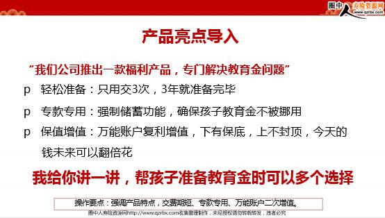 销售逻辑销售前准备告知及邀约 四问获签单 智赢首季峰 ——教育金销售逻辑 保险保的两个偶然两个必然 两个偶然:意外和疾病 两个必然:教育和养老 产品认知 客户需求 销售前准备 个人养老需求 n 老龄少子化、健康在恶化 n 不依靠、不拖累、不抱怨 子女教育需求 n 必须、无奈、被迫 n 高精力、高费用、高 客户购买年金险应对的需求 留学教育支出低龄化 年金险是刚需,所有人都需要 p 一句话需求:交三年,十年满期,领一辈子的养老金/只用交三次,获取 孩子未来能出国的教育金 p 一句话产品:快交快领,超高定价,利益可见,资金灵活,稀缺产品 p 一句话账户:收益可观,全国50亿荣耀xx账户额度,老客户及员工优 先享,稳健增值好工具 三句话快速认知产品 教育金 养老金 聚焦xx账户政策,主推5万元账户逢人便谈xx账户,必做5万计划书 销售主要聚焦点 只讲拜访不讲产品(没有功利心) 给一个无法拒绝的理由(服务客户) 只给客户两个时间选择(上午或晚上) 包装要送出的行销辅助品(礼多人不怪) 目的是见面后线下签单或邀约产说会(目的明确) 告知及邀约 告知邀约要点 行销辅助品邀约逻辑 XX,您好!马上要过节了,感谢您对我工作的支持,有一 个吉祥的小惊喜一定要送给您!我特意为您准备了福字/中国结, 能给您带来好运!您看今天下午有空还是明天上午有空?我给您 送到家里!一定要给我留时间!