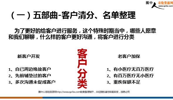 线上签单“五部曲” 课程纲要 一、疫情中的客户特点 二、线上经营,疫想不到 三、线上签单“五部曲” 疫情期间客户的特点: 1、工作停止,有大把的时间 2、和家人在一起,责任感强,可以商量 3、处于恐慌状态,怕死的心情空前的高 4、每天玩手机的时间增多 5、想花钱都花不出去 6、巴不得找人聊天 (一)五部曲-客户清分、名单整理 为了更好的给客户进行服务,这个特殊时期当中,哪些人愿意和我们聊聊,什么样的客户更好沟通,将客户进行分类老客户加保 1、有小医疗无百万医疗 2、有百万医疗无小医疗 3、重疾保额不足 客户分类 新客户开发 1、自已周边缘故客户 2、先前辅垫过的客户 3、多次沟通未促成客户 (一)五部曲-客户清分、名单整理 王姐您好!我是xx人寿xx。感谢您一直以来对我的信任和支持。病毒无情,xx有爱,xx人寿一直特别关注新老客户的健康,疫情期间公司专门推出防疫指南,既普及全民的健康知识,又让参与的客户获得抽奖机会。(调查问卷链接随后发送) (二)五部曲-工具先行,线上发送 (三)五部曲-特定人群,电话沟通 购买过重疾险的客户电话沟通:王姐您好!我是xx人寿xx,家里都好吧!给您发的问卷您答了吗?(自然切换到疫情信息)相信您和我一样,过年的这段时间没有外出,没有串门,没有聚会,相关的活动都取消了吧,下楼倒一下垃圾都要戴口罩,这场疫情真让我们心惊肉跳呀!我们的调查问卷也是普及健康知识的一种方式,同时也感谢您信任和支持!陈姐,今天利用这样一个时间和您聊一聊,针对您前期购买的保险我给您做了整理,同时盘点了您和家人现在的重疾保障,发现还有较大的缺口!
