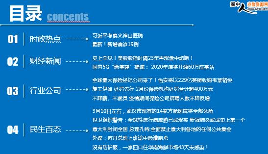 每日新闻速递 2020年3月11日 星期三 时政热点 财经新闻 行业公司 民生百态 习近平考察火神山医院 最新!新增确诊19例 史上罕见!美股股指时隔23年再现盘中熔断! 国内5G“新基建”提速: 2020年底将开通60万座基站 全球最大保险经纪公司来了!怡安将以229亿英镑收购韦莱韬悦 复工伊始 处罚先行 2月份保险机构处罚合计超400万元 不降薪、不裁员 疫情期间保险公司招聘人数不降反增 3月10日左右,武汉市现有的14家方舱医院将全部休舱 世卫组织警告:全球性流行病威胁已成现实 新冠肺炎或成史上第一个 意大利封闭全国 总理孔特:全面禁止意大利各地的任何公共集会 外媒:苏丹总理上班途中险遭刺杀 没有防护服,一家四口住华南海鲜市场43天未感染! 时政热点 习近平考察火神山医院 2020-03-10 12:31:08 来源:人民日报 10日上午,习近平一下飞机就专程前往火神山医院,了解医院建设运行、患者收治、医务人员防护保障、科研攻关等情况,亲切看望正在接受治疗的患者,关心慰问日夜奋战在抗击疫情第一线的医务工作者,勉励大家坚定信心,战胜疫情。 最新!新增确诊19例 2020-03-10 09:13 来源:人民网 3月9日0—24时,31个省(自治区、直辖市)和新疆生产建设兵团报告新增确诊病例19例,新增死亡病例17例(湖北17例),新增疑似病例36例。 3月9日0—24时,新增报告境外输入确诊病例2例(北京1例,广东1例)。截至3月9日24时,累计报告境外输入确诊病例69例。 累计收到港澳台地区通报确诊病例170例:香港特别行政区115例(出院60例,死亡3例),澳门特别行政区10例(出院10例),台湾地区45例(出院15例,死亡1例)。