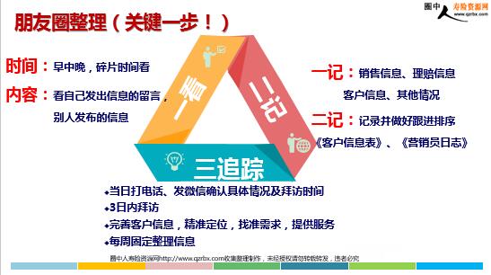 互联网营销之道 ——微信技巧篇 过去一个月销售经验的启示:新时代需要互联网思维!顺应发展才不会被淘汰! 每个人身上必带的电子产品是什么? 手机! 手机软件那么多,用哪个软件使用频率最高? 符合保险准客户年龄要求的占绝大多数 结论: ①用户普遍年轻; ②97.7%用户在50岁以下; ③86.2%的用户在18~35岁 第一步:好友定向分组 参考分类:老客户增员对象公司同事团队伙伴准客户对象影响力中心 通讯录 标签 新建 选定对象 给特定人群看特定的朋友圈 第二步 定向推送观念朋友圈 频繁、不定向地推送朋友圈,容易引起反感,惨遭屏蔽。指向性的内容按人群分组可见,可达到事半功倍的效果! 推送时请注意技巧:最好为短视频/少量图片+短文案简明易懂 博取眼球以节假日经营和观念政策为主(站在客户角度感受 把握分寸) 分组给新婚夫妻、特别是有过类似异议的客户看效果最好! 第三步 利用便签备好文案 随时出击 将文案、图片、视频等分组储存,日常联系客户、举办小说会等需要时可随时运用。(参考分组:健康险观念、年金险观念、健康险产品、年金险产品、异议处理等) 朋友圈发送原则及参考比例 7-9点 鸡汤/资讯/节日,12-13点 段子/软广告,17-19点 政策/硬广,睡前 故事/从业心得等只发正能量,涉及政治等敏感信息不发送;未经核实的信息不发送;坚持不懈重复去做。 家庭生活: 5% 成长与荣耀(学习、旅游、表彰等) :