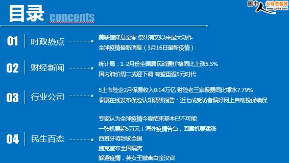 每日新闻速递 2020年3月17日 星期二 目录 时政热点 财经新闻 行业公司 民生百态 美联储降息至零 祭出有史以来最大动作 全球疫情最新消息(3月16日最新疫情) 统计局:1-2月份全国居民消费价格同比上涨5.3% 国内油价周二或迎下调 有望重返5元时代 5上市险企2月保费收入0.14万亿 财险老三家保费同比缩水7.79% 泰康在线发布保险认知调研报告:近七成受访者偏好网上自助投保续保 专家认为全球疫情今夏结束基本已不可能 一张机票超5万元!海外疫情告急,回国机票猛涨 西班牙将封锁全国 捷克宣布全国隔离 躲避疫情,英女王撤离白金汉宫 时政热点 美联储降息至零 祭出有史以来最大动作 2020-03-16 06:00:42 来源: FX168财经网 FX168财经报社(香港)讯 周日(3月15日)当地时间下午,美联储突然宣布降息至零,并启动了一项规模达7,000亿美元的大规模量化宽松计划,以保护经济免受经济危机的影响。 面对高度动荡的金融市场,美联储还将银行贴现窗口的紧急贷款利率下调了125个基点,至0.25%,并将贷款期限延长至90天。 美联储还将数千家银行的准备金率降至零。此外,在中央银行的全球协调行动中,美联储表示,加拿大银行,英格兰银行,日本银行,欧洲中央银行,美联储和瑞士国家银行已采取行动来提高美元流动性通过现有的美元掉期安排在全球范围内进行交易。 全球疫情最新消息(3月16日最新疫情) 2020-03-16 09:32 来源:澎湃新闻 据国家卫健委通报,3月15日0—24时,新增报告境外输入确诊病例12例(北京4例,广东4例,上海2例,云南1例,甘肃1例)。截至3月15日24时,累计报告境外输入确诊病例123例。 世卫组织每日疫情报告显示,截至欧洲中部时间15日10时(北京时间15日17时),中国以外新冠肺炎确诊病例较前一日增加10955例,达到72469例;中国以外死亡病例较前一日增加333例,达到2531例。 全球范围内,新冠肺炎确诊病例较前一日增加10982例,达到153517例;死亡病例较前一日增加343例,达到5735例。