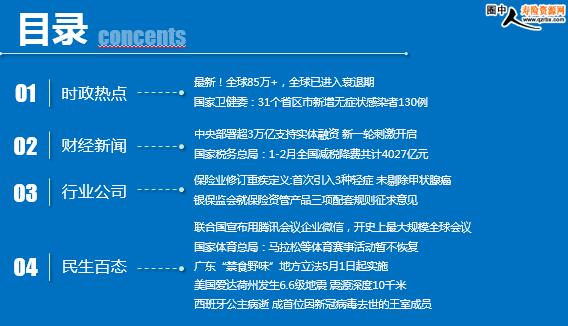 每日新闻速递 2020年4月2日 星期四 时政热点 财经新闻 行业公司 民生百态 最新!全球85万+,全球已进入衰退期 国家卫健委:31个省区市新增无症状感染者130例 中央部署超3万亿支持实体融资 新一轮刺激开启 国家税务总局:1-2月全国减税降费共计4027亿元 保险业修订重疾定义:首次引入3种轻症 未剔除甲状腺癌 银保监会就保险资管产品三项配套规则征求意见 联合国宣布用腾讯会议企业微信,开史上最大规模全球会议 国家体育总局:马拉松等体育赛事活动暂不恢复 广东“禁食野味”地方立法5月1日起实施 美国爱达荷州发生6.6级地震 震源深度10千米 西班牙公主病逝 成首位因新冠病毒去世的王室成员 时政热点 最新!全球85万+,全球已进入衰退期 2020-04-1 10:10 来源:中国经济网 美国约翰斯·霍普金斯大学公布的最新统计数据显示,截至北京时间4月1日7时14分,全球新冠肺炎确诊病例达856955例,死亡病例达42081例。 当地时间3月31日,古特雷斯表示,新冠病毒是自联合国成立以来我们共同面对的最大的考验。这一人类危机需要来自全球主要经济体协调一致,采取果断、包容和创新的政策行动,以及对最脆弱人民和国家提供最大程度的金融和技术支持。他也表示,国际货币基金组织重新评估了2020年和2021年的经济增长前景,宣布全球已进入衰退期。 国家卫健委:31个省区市新增无症状感染者130例,当日转为确诊病例2例 2020-04-1 11:00:42 来源:环球网 据国家卫健委网站消息,31个省(自治区、直辖市)和新疆生产建设兵团报告新增无症状感染者130例,当日转为确诊病例2例,当日解除隔离302例。尚在医学观察无症状感染者1367例,比前一日减少174例。