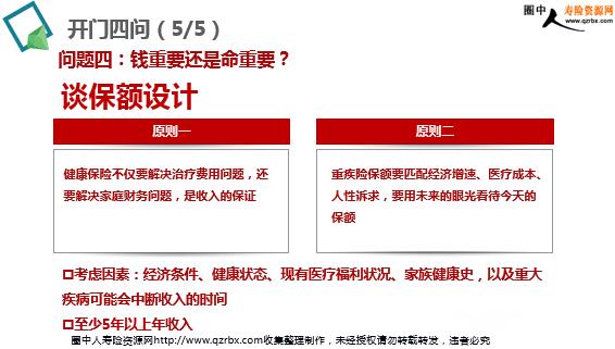 高额健康险销售逻辑 PART 1 突破观念 从加保入手 PART 2 简化流程 四问式销售 平均每个案件赔付仅为 7.09万元 数据来源:《健康大背景之理赔大数据》 市场实践现状 保额为什么是年收入5倍? 2年治疗期——自费药、特需门诊等支出 3年康复期——康复费、家庭收入损失费 康复治疗能显著提高患者后期生活质量 保额应该怎么定 50万大病保障是未来的基本需求 重疾险万元件是衡量代理人专业度的标准 保额需要做多少 帮客户节约钱,其实是低估客户的购买实力 他不在你这里买够,未来就会去别人那里买 当前 重疾险 销售四大误区 只顾治疗,不算细账 必须发生的康复期费用往往被忽略 只顾眼前,不顾未来 通胀造成物价上涨,重疾发生率造成保费上涨 只考虑促成,不考虑客户需求 为了促成容易,宁愿降低保额,忽略客户的真正需求 规避重疾销售误区四问式销售 开门四问(1/5) 问题一:健康问题会不会发生,何时发生? 越是在收入期,工作压力也越大,重疾就更容易发生,同时这个阶段生病也会对家庭影响更大重疾不是眼前的风险,如果现在就有重疾肯定买不了保险现在购买重疾险,其实是为了解决未来长期的