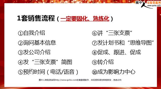 我的“123” 销售秘籍一、我的销售秘籍二、个人感悟三、4月业绩目标 我眼中的寿险营销 营销就像习武,我们要有自己的秘籍,平时勤加训练,这样才能有所修为! 我的营销秘籍 “123”销售心法: “1”——1套销售流程 “2”——2个讲解工具 “3”——3问促成方法 化繁为简,易学易用,复制传承 1套销售流程(一定要固化、熟练化) 自我介绍询问基本信息发公司介绍发“三张支票”简图预约时间(电话/语音) 讲“三张支票” 发计划书和“思维导图” 促成、跟进、促成转介绍成为影响力中心 2个讲解工具 “三张支票”——沟通理念 “思维导图”——讲解计划 三张支票 第一张支票就是我们的意外险。意外险是花最少的钱,做最大的杠杆,基本几百撬动几十万。意外有两个方面组成 1.就是意外医疗,比如说猫抓狗咬鱼刺卡喉摔倒跌伤烫伤。意外门诊都可以报销,而且我们现在的报销是非常快基本上都是无纸化办公。 2.就是我们的意外身故和伤残。这个其实是对家人的一份责任跟关爱,比如说我的意外身价是将近400万。我相信我们都不希望用到这些钱,但是意外并不是我们能够控制的,比如最近泉州酒店的事情。其实我们更多的不是给自己买,而是给家人,因为这是我们的责任。 三张支票(一) 三张支票(二) 三张支票(三) 第三张支票就是我们讲的教育和养老。我们说意外跟疾病是偶然的,那教育跟养老就必然的。养老需要花多少钱?关注什么?教育小孩读书,提供好的教育,那现在是不是也要早点多做准备呢?而养老这一块需要关注哪些? 1.我们的基本的生活费,衣食住行。 2.基本的医疗费用。我们经常讲身体,40岁年年不一样,50岁月月不一样,60岁我们就天天不一样。而退休以后,我们的收入是断崖式的下降。所以我们要准备好我们的医疗费用。 3.持续的照料费。据统计70岁以上的人20%需要被照顾0.5年到10年。人家说,久病床前无孝子。所以说贫穷是对长寿最大的惩罚,我们现在正常工作可能只有30年左右,我们需要把赚到的钱拿出小部分,为未来我们没有收入的时候做准备。 4.品质生活费。生活无忧,到处旅游非常美好,今天在南极过几天在巴西等等。有句话很经典。或许我们来不及年轻,但我们可以选择优雅的老去,如何优雅的老,而这些都需要钱。