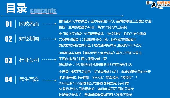 每日新闻速递 2020年4月17日 星期五 时政热点 财经新闻 行业公司 民生百态 霍普金斯大学数据显示全球病例超200万 美国停缴世卫会费引质疑 最新!全国新增确诊46例,其中12例为本土病例 央行数字货币首个应用场景落地 “数字钱包”将作为支付通道 70城房价回暖!38城新房价格上涨,这些城市涨幅最大 发改委批准新建西安至十堰高速铁路项目 总投资476.8亿元 中国银保监会就《保险代理人监管规定》再次公开征求意见 于泽获批担任中国人保副总裁一职 银保监会:中华财险保证保险部分业务存在侵权行为 中国首个新冠灭活疫苗:受试者最多打3针,临床前研究用时98天 多地推每周2.5天假期 “休休休”能否换来“买买买”? 2020已有5328家影视公司注销 影院票房几乎归零 31省份常住人口数据出炉:粤浙年增百万 四地负增长 这剧情还是来了:墨西哥贩毒集团向穷人发救济物资 时政热点 霍普金斯大学数据显示全球病例超200万 美国停缴世卫会费引质疑 2020年04月16日 06:52 来源:新华社 世界卫生组织:截至欧洲中部时间15日10时(北京时间15日16时),全球新冠确诊病例较前一日增加70082例,达到1914916例;死亡病例较前一日增加5989例,达到123010例。美国约翰斯·霍普金斯大学:截至美国东部时间15日10时(北京时间15日22时),全球新冠确诊病例达2000984例,死亡病例为128071例。 世卫组织总干事谭德塞15日对美国决定暂停资助世卫组织表示遗憾。他同时重申,新冠病毒是全人类共同的敌人,只有全球团结才能击败病毒。 最新!全国新增确诊46例,其中12例为本土病例 最新!全国新增确诊46例,其中12例为本土病例 4月15日0—24时,31个省(自治区、直辖市)和新疆生产建设兵团报告新增确诊病例46例,其中34例为境外输入病例,12例为本土病例(广东5例,黑龙江4例,北京3例);无新增死亡病例;新增疑似病例4例,其中3例为境外输入疑似病例(上海3例),1例为本土疑似病例(北京1例)。