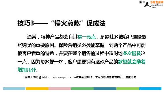 保险销售中的促成技巧 全体业务伙伴 课程大纲 掌握在某种特定情况下应该如何促成,能让保险营销员在实际销售的过程中得心应手,不会措手不及。 课程纲要 讲授 7大销售促成技巧: 单刀直入 “决定”促成法 “慢火煎熬”促成法重复检查 “选择”促成法 “列表”促成法 “故事”促成法 技巧1——单刀直入 对于通过陌生拜访或是电话营销获得与客户沟通的机会,由于无法马上建立完整、直观的印象,所以在这种情况下,选择单刀直入,通过直接说出产品能带给他的最大好处,抓住客户的注意力,无疑是最为合适的。 技巧1——单刀直入 采用这种方式最关键的,是要确保自己所说的好处能引起客户的注意力,营销员必须能从自己所销售的产品中找到真正的亮点。 技巧2——“决定”促成法 这种方法适用在产品说明的一开始。目的是要让客户在产品说明结束时就能许下承诺,而不是事后再说:“我得再考虑一下。” 技巧2——“决定”促成法 在刚开始时,先跟客户说明,如果他们肯放弃成见听取对产品的介绍,营销员就不会强求他们买他所销售的产品。采取这种方式,可以有效地避免客户采用托词委婉地拒绝进一步销售。只要产品说明确实证明可以满足他的需求,则有很大的概率促使他当即作出签单决定。 技巧3——“慢火煎熬”促成法 通常,每种产品都会有其某一亮点,是能让多数客户选择最终购买的重要原因。保险营销员必须能掌握一到两个产品中可能被客户看重的特色,并要在整个销售的过程中适时地多次提及这一点,因为每多提一次,客户想要拥有这款产品的欲望就会随着增加几分。 技巧3——“慢火煎熬”促成法