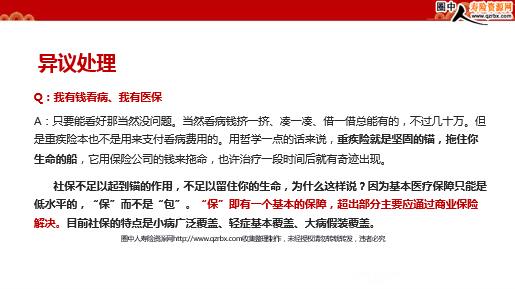 从故事展开销售道路 ——重疾险逻辑 ①故事一:讲述重疾险来源 ②故事二:一旦患上重疾,压力接踵而来 ③故事三:重疾愈发年轻化,多次赔付更保障 ④异议处理 故事一:讲述重疾险来源 简单寒暄,从健康切入:王姐,这段时间身体还好吗?(简单寒暄之后……)这年头,没个重疾险都不好意思说自己身体未来会很健康,我给你谈谈重疾险嘛。您别以为重疾险是保险公司发明的,其实啊,是一位医生发明的。这位医生在以前给一个肺癌患者手术治疗后,就建议她回去好好休息再定期复查。但没想到,该患者很快癌症扩散,不久就去世了。医生很难过,后来他发现这名患者有两个儿子要上学,因此她必须在手术后继续工作,不然孩子就得辍学。医生说了一段非常经典的话,也成为全世界重疾险产生的理论基础:“医生只能挽救一个人的生理生命,却不能挽救一个家庭的经济生命。”其实保险公司和医院都是在做“救死扶伤”的工作,只是我们是做在事前的“预防”,他们是做事后的“挽救”。 操作要点: ①重点是先讲故事,而不是先讲保险,为什么会有重疾险,就是为了挽救家庭的经济生命; ②重大疾病保险的根本目的是为病情严重、花费巨大的疾病治疗提供经济支持; ③从重大疾病保险起源的故事,诠释了重疾险的作用:除了很少一部分作为医疗费用的补充,主要是对于主动型收入损失的弥补; ④重疾险是一个工作收入损失险,因此我们常说重疾险购买的保额是根据客户年收入确定的。 生活不易,且行且珍惜:王姐,其实我们都知道,未来肯定有一天免不了会得一场疾病,当然病痛这些都可大可小,但是重疾险就是在您实在干不动活的时候帮你扛起一片天。身体是革命的本钱,我们这身体现在要扛起太多的重担了,房子、车子、孩子、家里的老爷子还有我们自己的梦想。生活确实不易,我们的担子太重,这些东西压在 身上早晚有一天会把我们的身体压垮。如果有一天我们抗不住了,那时该怎么办呢? 故事二:一旦患上重疾,压力接踵而来 故事二:一旦患上重疾,压力接踵而来 以前我有一位客户,她的老公是位医生,虽然她老公对保险公司半信半疑,但是她对自己家庭的保障是非常看重的,就为自己老公购买了一份重疾险。你知道医生都会经常加班熬夜做手术嘛,长期熬夜就会导致免疫力低下。一年过后,她的老公就体检出来得了癌症,作为医生当然知道治疗的费用是多么的昂贵,虽然他们有一点积蓄,但是对于医疗费用来说简直是杯水车薪。 事发之后,虽然这位客户和她老公的亲戚朋友都带几千上万的钱来看望他们,但相比于客户购买重疾险的几十万理赔款,只能说是帮了小忙而已。再说了,亲戚朋友带几千上万的看望费来,欠下的这个人情可不是轻易就还清的。 操作要点 ①不只是医生,所有作为家庭支柱的经济来源,基本上都会经常加班熬