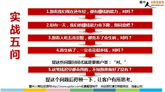 健康险销售逻辑 根据客户需求分析,通过对健康风险理念的学习,结合健康险常见异议处理方法,掌握健康险销售逻辑。 课程目的导入理念—三大发病原因 触发需求—三大应对情况 引入产品—三种应对方式 实战五问—促成提问技巧 导入理念—三大发病原因 PART 1 A金钱?B爱情?C地位?D友情? 如果再加上健康呢? 有妻有子有家庭,没有健康等于0! 怎样才能更健康? 据卫生部统计,人一生罹患重大疾病的概率为72.18%。我国每年新发癌症200万,新发心脑血管疾病150万。用精确测算形式,即每分钟,全国就有3.81人新发癌症,2.85人新发心脑血管疾病。重疾风险离我们有多远? 很久以前,我们的地球空气清新,小河清澈见底,树木茂盛,百鸟争鸣…… 现在的天空经常被雾霾笼罩,水质恶化,土壤污染不断加剧…… 原因一:环境的改变 改革开放前,中国人基本以素食为主,那时的疾病主要表现在营养不良、缺乏蛋白质。改革开放以后,随着人们生活水平的不断提升,饮食结构也随之改变,出现大面积的“三高” 高血脂、高血压、高血糖。心脑血管疾病发病时间提前至30岁左右。所以,饮食结构的改变也是重疾发病率提升的重要原因,合理膳食我们应该共同关注。