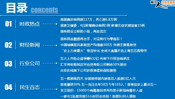 每日新闻速递 2020年5月6日 星期三 时政热点 财经新闻 行业公司 民生百态 时政热点 美国确诊病例超117万,死亡超6.8万例 国家卫健委:4日新增确诊病例1例 新增无症状感染者15例 国务院设立新的小组,再赴武汉 重磅!国务院金融委再出手,对这类行为零容忍! 中国城镇居民家庭资产均值逾300万 负债主要是房贷 “史上力度最大”带货秒光 全球大直播开启上海五五购物节 五大上市险企首季赚632亿 利率下行投资端承压 汇丰将收购其在华合资寿险公司剩余50%股份 众安在线旗下公司获香港虚拟保险牌照 五一假期前四天 全国接待国内游客总人数超1亿人次 旅客暴跌99% 五一当日去年50万今年119人!香港迎史上最冷五一 世卫组织:15000个病毒基因序列均显示新冠病毒非人造,美国质疑应拿出证据 一家4口坠黄河超53小时仍未找到!救援队80人搜救 时政热点 美国确诊病例超117万,死亡超6.8万例 2020-05-05 07:26:54 来源:观察者网 据美国约翰斯·霍普金斯大学疫情实时监测系统统计,截至美东时间5月4日下午6时32分,美国已有新冠病毒感染病例1178906例,其中包括死亡病例68689例,共检测7285178例。在过去约24小时,美国新增确诊24285例,新增死亡1231例。 国家卫健委:4日新增确诊病例1例 新增无症状感染者15例 2020-05-05 07:35 来源:新华网 5月4日0—24时,31个省(自治区、直辖市)和新疆生产建设兵团报告新增确诊病例1例,为境外输入病例(在上海);无新增死亡病例;无新增疑似病例。