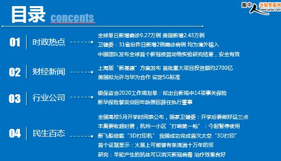 每日新闻速递 2020年5月8日 星期五 目录 时政热点 财经新闻 行业公司 民生百态 全球单日新增确诊9.27万例 美国新增2.43万例 卫健委:31省份昨日新增2例确诊病例 均为境外输入 中国团队发布全球首个新冠疫苗动物实验研究结果,安全有效 上海版“新基建”方案发布 首批重大项目投资额约2700亿 美国拟允许与华为合作 设定5G标准 银保监会2020工作规划单:拟出台新规中14项事关保险 新华保险黎宗剑因年龄原因辞任执行董事 全国高校5月开学时间表公布,国家卫健委:开学后要做好这三点 丰巢要收超时费,杭州一小区“打响第一枪”:今起暂停使用 新飞船搭载“3D打印机” 我国成功完成首次太空“3D打印” 首个证据显示:火星上可能曾有条流淌十万年的河 研究:羊驼产生的抗体可以消灭新冠病毒 治疗效果良好 时政热点 全球单日新增确诊9.27万例 美国新增2.43万例 2020-05-07 12:40:52 来源:金融界网站 美国约翰斯·霍普金斯大学的疫情统计数据显示,5月6日全天,全球新增新冠肺炎确诊病例9.27万例,其中美国新增新冠肺炎确诊病例2.43万例。截至北京时间5月7日10:48,全球累计确诊375.5万例,累计死亡26.4万例。 卫健委:31省份昨日新增2例确诊病例 均为境外输入 2020年05月07日 08:04:17 来源:中财网 5月6日0—24时,31个省(自治区、直辖市)和新疆生产建设兵团报告新增确诊病例2例,均为境外输入病例(上海1例,广东1例);无新增死亡病例;新增疑似病例2例,均为境外输入病例(在上海)。