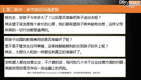 日军曾经的经典战术“万岁冲锋” 保险产品更新换代,销售难度逐步升级时代在发展,技术在进步, 客户在升级,你还在原地。保险回归保障 长期期缴为主 时间那么长,年化受益那么低,客户为什么要买理财保险? 营销知识不成体系,销售信心深感不足 看不出客户风险,问不清客户痛点 听不懂客户说话,说不出客户需求 知识呈现碎片化 难以实现战斗力 营销模式持续不变,销售业绩难以支撑 普客关注利益,营销成本增加 高客关注功用,银保力不从心 会议营销保费持续下滑 高客难以邀约参加会议 我们每个人都长了向外看的眼睛,却没有长看自己的眼睛。 心理学告诉我们:行为不改,结果不变!当我们不断的去重 复错误的行为的时候,又期盼得到正确的结果是根本不可能。 如何保持在行业内长久的生存下去? 安迪在肖申克监狱的生存之道 专业知识过硬,从而不可取代 成为客户顾问,拿走他的担忧 当你没有利用价值了 也就没有存在必要了 实战案例演练 夏女士,29岁,全职太太,2个孩子的妈妈。夫妻感情和睦,除夏女士 要求购买的奢求品以外,每月有几万元的零花钱。