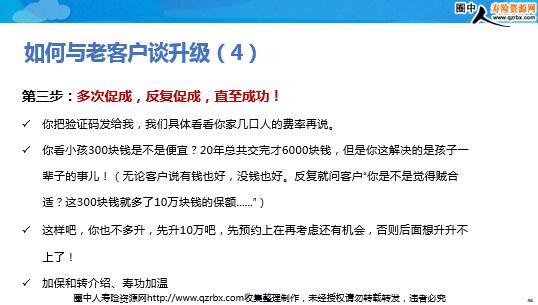 升老促新 全能守护 认知决定行动 认知决定行动(1) 以真情对待客户;以热情感染客户 升级的实质是针对不同人群的特定重疾;要么高发,要么高增速, 用特惠费率锁定一生的健康保障 小孩和男人看了全都升,因为太便宜 女人看了也升,因为觉得那些病种离我们太近 这是真正的xx守护 认知决定行动(2) p 由于客户量太大,采用先微信/电话告知,犹豫/没 回应的客户再见面促成的方式 p 动作要”迅猛“ ,覆盖要”广泛“ ,态度要”兴奋 “ ,逻辑要”专业“ 对于升级行动的自我准备 认知决定行动(3) 代理人对客户的职业责任 主管对团队的榜样责任 公司让你干啥就干啥!肯定是有道理的,别浪费时间想没用的,最后受损的还是自己 我出8万保费,初佣都3万多,是不是听话、照做就可以保障和利益兼得 公司不仅帮你挣钱,还帮你增加客户粘合度,不干就是没想明白 如何谈老客户升级 如何与老客户谈升级(1) 第一步:微信/电话告知升级这个好消息 告诉你一个特好消息,四月我们对老客户开放一次健康险特惠升级,针对目前市场上少儿、男性、女性各自特定疾病发病超过80%的高发病种进行保额升级,价格特别便宜,但是只有保额超过10万的健康险老客户才有资格参与。