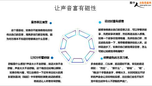 销 售 技 巧 如何让你的声音更具有魅力 在社交礼仪中,好听、圆润的声音往往更受人欢迎,同时在销售过程中更加也容易取得客户的信任,进而显著提高成交率与转介绍成功率,有的人先天声音条件优越,动听悦耳,但是更多人可以通过科学、规范的练习,让声音也可以像中央台主持人的一样圆润、饱满、有磁性。下面就为大家带来销售技巧之“如何增加声音的魅力“。 语调与呼吸 如何增加穿透力 如何增加感染力 如何富有磁性 如何让你的声音更具有魅力 语 调 训 练 与 呼 吸 技 巧 如果你板着脸讲起话来相应地也很难有热情,所以这种热情程度跟你的身体语言有很大的关系。销售人员要尽可能地增加你的面部表情的丰富性,如果你希望热情来影响客户,你的面部表情就一定要丰富起来,同时要注意以下两点:1、自我调节。沟通多了难免感觉疲倦,精神状态也会越来越差。你的精神状态,客户是可以感受到的,如果你自己没注意,就可能因此而失去一次机会。 2、把握尺度。凡事都应有个适当,有的人喜欢跟热情的人沟通,有的人却不喜欢跟太热情的人打交道。不要在表现得太过热情,太过热情了反而可能让客户产生防备心理。 语调要热情 呼吸训练——共鸣练习 ①可以通过特殊字母,如en 、ang等发音与鼻腔一起震动,这种方法可以使你的音色更加饱满,音色更亮;