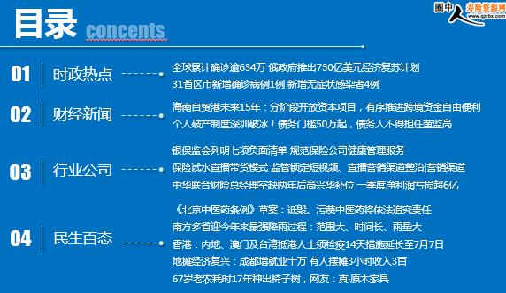 每日新闻速递 2020年6月4日 星期四 时政热点 财经新闻 行业公司 民生百态 时政热点 全球累计确诊逾634万 俄政府推出730亿美元经济复苏计划 31省区市新增确诊病例1例 新增无症状感染者4例 海南自贸港未来15年:分阶段开放资本项目,有序推进跨境资金自由便利流动 个人破产制度深圳破冰!债务门槛50万起,债务人不得担任董监高 银保监会列明七项负面清单 规范保险公司健康管理服务 保险试水直播带货模式 监管锁定短视频、直播营销渠道整治|营销渠道 中华联合财险总经理空缺两年后高兴华补位 一季度净利润亏损超6亿 《北京中医药条例》草案:诋毁、污蔑中医药将依法追究责任 南方多省迎今年来最强降雨过程:范围大、时间长、雨量大 香港:内地、澳门及台湾抵港人士须检疫14天措施延长至7月7日 地摊经济复兴:成都增就业十万 有人摆摊3小时收入3百 67岁老农耗时17年种出椅子树,网友:真·原木家具 时政热点 全球累计确诊逾634万 俄政府推出730亿美元经济复苏计划 2020-06-03 07:07 来源:环球网 美国约翰斯·霍普金斯大学发布的实时统计数据显示,截至北京时间6月3日6时30分左右,全球累计确诊新冠肺炎病例6340811例,累计死亡378359例。 据俄罗斯新冠病毒防疫官网2日最新数据,过去24小时,俄罗斯新增8863例新冠肺炎确诊病例,累计确诊423741例,新增死亡病例182例,累计死亡病例5037例。6月2日俄总理米舒斯京向俄总统普京提交疫情经济复苏计划。俄政府计划在两年内花费5万亿卢布(约合730亿美元)实施该计划。计划将于今年7月初开始执行。 31省区市新增确诊病例1例 新增无症状感染者4例 2020/06/03 08:59 来源:国家卫生健康委员会官方网站 6月2日0—24时,31个省(自治区、直辖市)和新疆生产建设兵团报告新增确诊病例1例,为境外输入病例(广东1例);无新增死亡病例;新增疑似病例1例,为境外输入病例(上海1例)。 当日新增治愈出院病例1例,解除医学观察的密切接触者370人,重症病例减少1例。