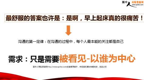 看清客户的需求--共情心法 测试题 早上起床的时候,老婆对老公说:老公,我太困了,我一点都不想起床去上班,我好痛苦啊! 如果你是老公,你会如何回应老婆?( ) A.迟到了怎么办? B.我教你一个清醒的方案...... C.你就辞职吧 D.是啊,早上起床真的很痛苦! 最舒服的答案也许是:是啊,早上起床真的很痛苦! 需求:只是需要被看见-以谁为中心 沟通的第一定律:在沟通的过程中,每个人最本能的关注都是自己 以“我”为中心的沟通的方式,被称之为“I”型沟通。I代表“我” 需求 否定 I型沟通的特点:好像解决问题的核心人物是我,而不是他本人。 满足对方 对方 陷入I型沟通带来的沟通“破坏” 两种“破坏” 1让对方自我封闭,关上沟通的大门(这样我们就真的没有办法发掘客户真正的问题) 2自我辩解,造成争执冲突 (这样我们就有可能和客户陷入对立面) 和对方建立沟通,需要调整到对方的情绪频道上主语由I变为YOU 例如:你认为、你觉得这种沟通暗示,称之为U型沟通。 U型沟通=你+感受 如何从I型沟通转变为U型沟通 学会发送邀请卡打开客户的话匣子 方法一 学会提问,让TA自己找到答案