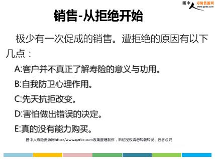 排除障碍 从容展业 提升业务水平,争取更大的业务量,一直是我们业务伙伴最关切的问题。 在展业的过程中,我们常常会被客户这样那样的理由所拒绝。如何提高业务能力,行之有效的为客户解疑答惑,取得信任,需要我们预先了解熟知,做好充分准备,才能从容面对,游刃有余。 前 言 销售障碍 应对话术 销售障碍 角 色 需要的障碍 需要障碍,是指顾客认为自己不需要推销的保险商品而设置的障碍。它常因顾客的认识水平、心理成见或推销员不了解顾客情况等造成。 购买力障碍.指顾客认为无钱购买保险而设置的种种障碍。顾客借口购买力不足,并非真的无力承担保险费,只是不想购买而已。应设法让顾客明白,购买保险并不昂贵,能够负担的起。保险既能提供经济保障,也能稳定资产和经营。 购买权障碍,是指顾客以无购买决策权为借口而打发推销员。 购买时间障碍,是指顾客在推销中有意拖延时间,希望延缓作出决定的一种做法。应向顾客指出拖延可能带来的危险后果,强调马上投保的重要性,并举例予以说明。 认识偏见障碍,是指顾客因迷信,他人误导或认识上的其它偏见而设置的推销障碍。 (1)对保险公司的疑议 销售信任障碍 (2)对保险产品的疑议 销售信任障碍