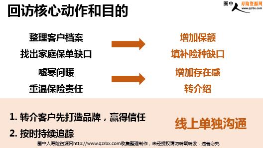 线上做好三步 微信签单挡不住 心态及展业形式的转变 线上签单三步 感悟及目标 首先看到的是什么? 面对困难 杯子里只剩半杯水 杯子里还有半杯水 危险 机遇 看到的两种结果代表两种心态 面对困难 及时调整自强方能不息 面对困难 心态及展业形式的转变 线上签单三步 感悟及目标 总结线上签单三步 1、线上获取客户资源 2、意向客户单独沟通 3、及时记录按时追踪 挖掘客户资源 对于业务员来说最缺乏的是什么?客户资源 线上展业尤为如此,线上客户主要来源: 朋友圈 微产会 挖掘客户资源 对于业务员来说最缺乏的是什么?客户资源 线上展业尤为如此,线上客户主要来源: 朋友圈 微产会 老客户回访