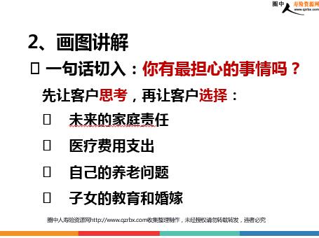 爱与责任成就家庭保单 真正认识“家庭保单” 一、认知的改变 过去的销售模式—— 两个身边事惊醒了我 人协助她一起打理生意,一家三口安稳幸福 身边事1:朋友离世的锥心之痛 妈妈能赔多少钱?” 再也不会醒来了。” 赔的!” 在地上默默地抽烟,烟头满地…… 身边事2:亲人的意外让我深深自责 顶梁柱变成了拖油瓶…… 两个悲剧让我深深的反思—— 重新认识家庭保单—— 重新认识家庭保单—— 二、画图讲保险 我的家庭保单销售流程 收集信息 画图讲保险 异议处理及促成 1、收集信息 【交换法】: 先说自己的信息,再请教客户的信息 适用于收集个人和家庭信息 例:我是属龙的,你是属什么的呢? 我家孩子是10月出生的,你家孩子是上半年 还是下半年呢? 人与人之间拉近距离最快的方法是交换彼此的秘密 【询问推测法】:适用于家庭财务信息