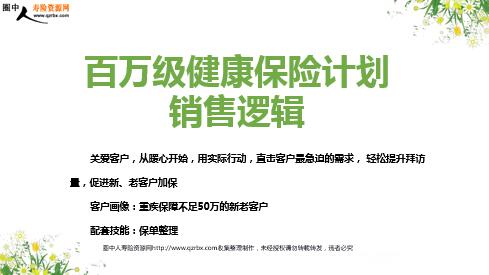 百万级健康保险计划 销售逻辑 关爱客户,从暖心开始,用实际行动,直击客户最急迫的需求, 轻松提升拜访量,促进新、老客户加保 客户画像:重疾保障不足50万的新老客户 配套技能:保单整理 第一步:约访 业务员:张老师,你好,因为疫情的原因,已经两个月没来为你服务了,疫情期间有很多朋友向我咨询健康险,今天我们全线复工啦,公司要求我们每天服务一个家庭,帮助咱们整理家庭保单情况,我第一个就想到你啦, 你在家么,我过来找您。业务员:这是疫情发生开始到现在,xx做的一系列社会关爱活动中的其中一项。(若客户拒绝)业务员:好的,那我先为其他好朋友做年检服务,明后天我再联系你。 操作要点:不与客户纠结,客户如果拒绝就寻找下一个客户。 第二步:面见 老客户版:业务员:“XX,前几天我把你们家的健康保障做了一个梳理,我跟你见个面,和您对一 下,这是您作为老客户的权益,也是公司对我们复工后的工作要求。” 新客户版:业务员:“XX,现在已经复工了,跟据这次疫情发生的突然性和严重性,公司要求我们对身边的朋友做一次“风险保障普查”,因为你不是我们公司的老客户,我对你的健康风险保障不清楚,所以我们要见个面,对你做一次专业的服务” 操作要点:根据情况进行保单整理,寻找出老客户的保障缺口;新客户就以保单整理为服务入口,寻求见面。 第三步:导入风险 老客户版:热点话题,切入保险业务员:这次疫情真的是影响挺大的,我看到报道,受感染的人虽说国家给报销医疗费用,但这仅仅是“治”的钱,还有后面“疗”、“费”的钱,又是一大笔。这次疫情很多人都非常担忧甚至非常害怕,根据您家的保单情况,咱们来梳理一下,看看这三种钱都准备了没有。解释“治”“疗”“费” 治:治病期间的费用,主要包含手术费、医药费、床位费、检查费等;疗:疗养期间的费用,主要包含:护理费、营养费、康复费、交通费等费:日常生活的费用,主要包含:车贷、房贷、子女教育、父母养老、日常生活开销针对需求详细讲解业务员:非常抱歉,由于之前的各种原因,对未来风险的预估不足,梳理完你们家的健康保障后发现,有几项很重要的缺口,比如(发生恶性肿瘤,医保外的靶向抗疫药品的缺口,住院医疗报销额度过低,重疾给付保额没有涵盖收入损失和康复费用,面对突如其来的重大风险,没有垫付功能,权威专家服务缺失……)