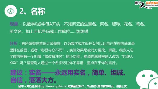 保险人如何经营朋友圈 前 言 微信在保险业里越来越火,微信获客屡屡签单的故事,让很多人垂涎欲滴。然而,正如微信真正火起来的原因一样,它是一个在众多熟人与半熟人之间“分享干货得天下”的地方。想在微信优雅、漂亮地营销,看起来是一件很有风险和难度的事情。那么,学习一下如何优雅的在微信上做营销就变得很有必要。 现象:风景、花、名片、卡通、红白蓝底证件照、锥子脸自拍……统统错! 分析:风景太滥、花草太泛,名片看不清+商业味太重,证件照,不仅刻板,而且似乎打算“证明你是你”,让人疑虑重重、戒备暗生。 1.头像 建议:想清楚你打算传递什么形象、留下什么印象! 从生活照中截取充满自信、自然微笑的脸庞,甚至一个搞怪的表情,都会表明你是个真实、清晰的人,暗示自己是生活中的朋友,而不是微信上的推销员。 要注意视觉效果,别弄全身像,半身照就好。 2、名称 现象:以数字0或字母A开头,不知所云的生意名、网名、昵称、花名、笔名、英文名、加上手机号码或工作单位……统统错 分析:被所谓微信营销大师蛊惑,以为数字或字母开头可以让自己在微信通讯录里排在前面,或者“彰显与众不同”,实际效果是被对方更改、屏蔽。很多人忘了微信里有一个叫做“修改备注名”的小功能,难道你愿意被别人改为“代理人XXX”吗?指望别人通过一个名字记住你不靠谱,重点在于你的言行。 建议:实名——永远用实名,简单、坦诚、自信,落落大方。 3.个性签名 现象:“预防风险,才能……”、“保险理财,拨打我的电话1XXXXXXXXXX”……统统错。 分析:个性签名不当危害不大,精心设计的话倒是很好的加分项。个性签名是自己的名字的辅助,只有在第一次加好友时会起到辅助说明作用,对方不会经常看,实际用途不是特别大,用来做广告似无可厚非,出发点超好是可以突出与别人不同的特质。 建议:既然叫“个性签名“,就值得多花点心思、体现出文采,让别人从短短的一句话中知道你应该是个什么样的人——让对方记住你的,是你与别人不同之处。