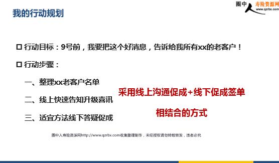 巧用三种方法 促成xx升级 太保及时雨 想客户之所需 公司迎合市场需求,弥补现有产品体系的空白 此项利好,正是疫情后,快速联系客户的最佳理由 180天的观察期,早升级一天,对客户早负责任一天 对于客户,较低的保费,就可以享受升级后的保障我要尽快将好消息告诉客户 我眼中的“xx升级”活动 行动目标:9号前,我要把这个好消息,告诉给我所有xx的老客户!行动步骤:一、整理xx老客户名单 二、线上快速告知升级喜讯三、适宜方法线下答疑促成 我的行动规划 采用线上沟通促成+线下促成签单相结合的方式 一、整理老客户名单 共计9位老客户 投保人都是工薪阶层 1位客户的母亲曾接受公司理赔——先告知客户的母亲,再沟通客户 4位客户是一个家庭的一家四口——发送升级信息给家里能做主的人 1位客户是之前转介绍人推荐的——发信息给转介绍人,再沟通客户 1位是此前业务员自己的保单——发送信息给业务员 2位是客户孩子的xx保单——发送信息给孩子父母 二、线上快速告知升级喜讯 线上快速告知升级的亮点以心血管疾病的发生为例,说明 xx升级前和升级后的差异 线上尝试做升级促成此次升级,仅对购买过xx的老客户开放,还有时间限制,其他的没有这个资格 三、适宜的方法 做好线下促成签单 无论客户是否同意升级,都要把握好与客户线下沟通的机会 1、决定升级的客户: 邀约话术:**,上次电话提到的xx升级,我们见个面,用1分钟的时间,我帮你用xx个险做个录入,非常方便! 操作目的:借机了解客户有没有加保的可能。2019年客户享受了公司的xx服务,此次升级的保费,虽然不够享受xx服务,但可以通过公众号,帮助客户关联2020重疾xx,为客户后期的加保打基础。2、决定放弃的客户:邀约话术:**,您下班方便吗?在这个非常时期,如果您不忌讳的话,我们见个面。只需占用您一点儿时间,在我们的放弃书上签字,放弃xx升级的机会。操作目的:见面后再次为客户讲解xx升级的亮点,了解客户的真实想法,给客户提供建议,促成xx升级。我们虽然无法左右客户的想法,但是我们可以了解客户的需求,聆听他们的心声