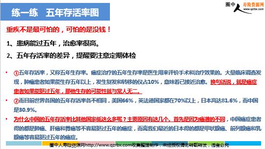 五年存活率图 ①五年存活率,又称五年生存率。癌症治疗的五年生存率是医生用来评价手术和治疗效果的。大量临床调查发现,肿瘤患者如果能生存五年以上,发生复发和转移的仅占10%,意味着已接近治愈。换句话说,就是癌症患者如果能挺过五年,那他生存的可能性就与常人无二。 ②而目前世界各国的五年存活率各不相同,美国66%,英法德国家都在70%以上,日本高达81.6%,而中国是30.9%。为什么中国的五年存活率比其他国家低这么多呢?主要原因有这几个。首先是因为癌谱的不同,中国癌症患者得的都是肺癌、肝癌和胃癌等不容易挺过五年的癌症,而离我们最近的日本得的都是甲状腺癌、前列腺癌和乳腺癌等容易挺过五年的癌症。 练一练 五年存活率图 重疾不是最可怕的,可怕的是没钱! 1、患病能过五年,治愈率很高。 2、五年存活率的差异,提醒要注意定期体检 其次是因为中晚期比例偏高,比如肺癌,五年存活率仅13%,因为90%肺癌患者发现时已经属于中晚期的了,所以定期体检真的很重要,早发现早治疗、五年存活率才会高。再者是重治疗而轻康复。其实术后五年内是癌复发转移的高危期,这五年期间不仅要好好治疗、更要好好休息、好好康复。比如说我们很熟悉的曾经中国好声音八强姚贝娜(讲一讲姚贝娜)……可见,一场重病要好好休息五年,才能更好康复。与之相反,另一位也得了乳腺癌的歌手蔡琴(讲一讲蔡琴)……可见,一场重病只要好好休息五年,就能很好康复。 练一练 五年存活率图 3、传统重治疗轻康复观念带来的影响。案例佐证。 4、只要好好休息,就能很好康复,案例佐证。中国五年存活率低还有一个最主要的原因是财务支持不够。欧美日本因为国家福利好百姓保险足,所以治病时该怎么治就怎么治,养病时衣食无忧地养病。而中国虽然人人有社保,但社保只是保不是包、加上商业险不足,所以治病时有多少钱就治多少,更不要提养病时能衣食无忧地养病了。比如我们很熟悉的相声演员傅彪(讲一讲傅彪) ……一场重病治疗康复同样重要,如果术后五年不工