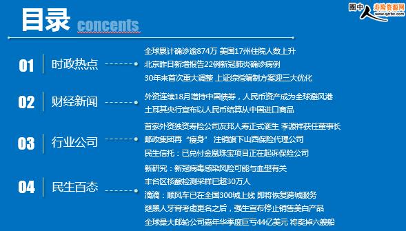 每日新闻速递 2020年6月22日 星期一 时政热点 财经新闻 行业公司 民生百态 时政热点 全球累计确诊逾874万 美国17州住院人数上升 北京昨日新增报告22例新冠肺炎确诊病例 30年来首次重大调整 上证综指编制方案迎三大优化 外资连续18月增持中国债券,人民币资产成为全球避风港 土耳其央行宣布以人民币结算从中国进口商品 首家外资独资寿险公司友邦人寿正式诞生 李源祥获任董事长 邮政集团再“瘦身” 注销旗下山西保险代理公司 民生信托:已兑付金凰珠宝项目正在起诉保险公司 新研究:新冠病毒感染风险可能与血型有关 丰台区核酸检测采样已超30万人 滴滴:顺风车已在全国300城上线 即将恢复跨城服务 继黑人牙膏考虑更名之后,强生宣布停止销售美白产品 全球最大邮轮公司嘉年华季度巨亏44亿美元 将卖掉六艘船 时政热点 全球累计确诊逾874万 美国17州住院人数上升 2020-06-21 06:54 来源:海外网 美国约翰斯·霍普金斯大学发布的实时统计数据显示,截至北京时间6月21日6时30分左右,全球累计确诊新冠肺炎病例8747136例,累计死亡462088例。 本周全美各地的新冠肺炎新增确诊病例激增,每日平均新增病例比此前增加约20%,达到每天近2.4万例。美国广播公司的分析则显示,全美17个州因确诊新冠肺炎而住院治疗的人数正在增加,增幅最大的州包括阿拉斯加州、阿拉巴马州、阿肯色州、亚利桑那州、佛罗里达州、夏威夷州、得克萨斯州等等。此外,全美13个州和华盛顿哥伦比亚特区的新冠肺炎新增死亡人数也呈上升趋势。 北京昨日新增报告22例新冠肺炎确诊病例 2020-06-21 08:51 来源:中国长安网 6月20日0时至24时,北京新增报告本地确诊病例22例、疑似病例3例、无症状感染者3例;无新增报告境外输入确诊病例、疑似病例、无症状感染者。 新增确诊病例中,丰台区10例、大兴区8例、海淀区3例、通州区1例。