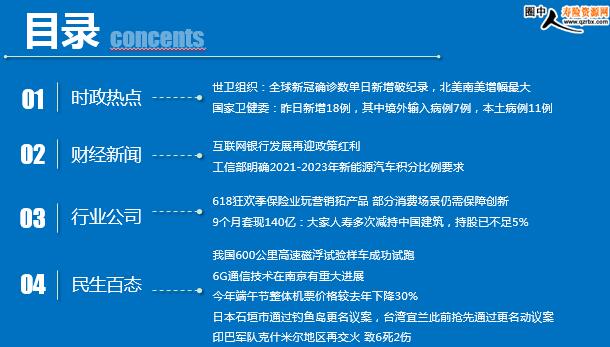 每日新闻速递 2020年6月23日 星期二 时政热点 财经新闻 行业公司 民生百态 时政热点 世卫组织:全球新冠确诊数单日新增破纪录,北美南美增幅最大 国家卫健委:昨日新增18例,其中境外输入病例7例,本土病例11例 互联网银行发展再迎政策红利 工信部明确2021-2023年新能源汽车积分比例要求 618狂欢季保险业玩营销拓产品 部分消费场景仍需保障创新 9个月套现140亿:大家人寿多次减持中国建筑,持股已不足5% 我国600公里高速磁浮试验样车成功试跑 6G通信技术在南京有重大进展 今年端午节整体机票价格较去年下降30% 日本石垣市通过钓鱼岛更名议案,台湾宜兰此前抢先通过更名动议案 印巴军队克什米尔地区再交火 致6死2伤 时政热点 世卫组织:全球新冠确诊数单日新增破纪录,北美南美增幅最大 2020-06-22 10:25 来源:澎湃新闻 6月21日,世界卫生组织(WHO)报告说,当日全球新冠肺炎病例单日新增再创记录,在24小时内增加了183020例。 另据美国约翰斯·霍普金斯大学网站统计,截至6月22日,全球累计确诊达8927195例,死亡467636例。 国家卫健委:昨日新增18例,其中境外输入病例7例,本土病例11例 2020-6-22 09:35 来源:成都商报 6月21日0—24时,31个省(自治区、直辖市)和新疆生产建设兵团报告新增确诊病例18例,其中境外输入病例7例(上海3例,陕西2例,天津1例,辽宁1例),本土病例11例(北京9例,河北2例);无新增死亡病例;新增疑似病例2例,均为本土病例(均在北京)。 当日无新增治愈出院病例,解除医学观察的密切接触者144人,重症病例与前一日相比减少3例。