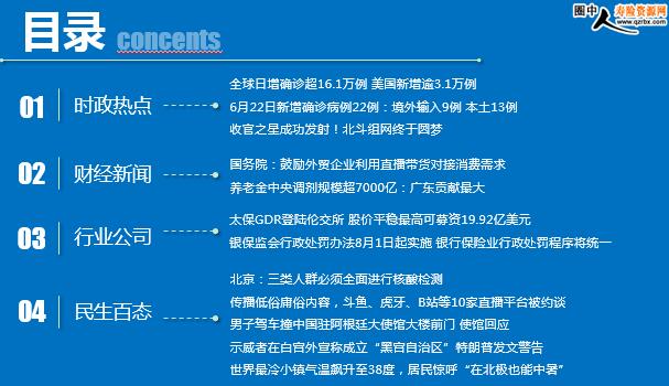 每日新闻速递 2020年6月24日 星期三 时政热点 财经新闻 行业公司 民生百态 时政热点 全球日增确诊超16.1万例 美国新增逾3.1万例 6月22日新增确诊病例22例:境外输入9例 本土13例 收官之星成功发射!北斗组网终于圆梦 国务院:鼓励外贸企业利用直播带货对接消费需求 养老金中央调剂规模超7000亿:广东贡献最大 太保GDR登陆伦交所 股价平稳最高可募资19.92亿美元 银保监会行政处罚办法8月1日起实施 银行保险业行政处罚程序将统一 北京:三类人群必须全面进行核酸检测 传播低俗庸俗内容,斗鱼、虎牙、B站等10家直播平台被约谈 男子驾车撞中国驻阿根廷大使馆大楼前门 使馆回应 示威者在白宫外宣称成立“黑宫自治区”特朗普发文警告 世界最冷小镇气温飙升至38度,居民惊呼“在北极也能中暑” 时政热点 全球日增确诊超16.1万例 美国新增逾3.1万例 2020-06-23 07:46 来源:海外网 美国约翰斯·霍普金斯大学发布的实时统计数据显示,截至北京时间6月23日6时30分左右,全球累计确诊新冠肺炎病例9036002例,累计死亡469939例。全球单日新增新冠肺炎确诊病例161402例,单日新增死亡病例4769例。 截至北京时间6月23日6时30分左右,美国累计确诊2305950例,累计死亡120340例。与前一日6时30分数据相比,美国新增确诊病例31670例,新增死亡病例405例。 6月22日新增确诊病例22例:境外输入9例 本土13例 2020-06-23 08:55 来源:中国经济网 据国家卫生健康委员会官方网站消息,6月22日0—24时,31个省(自治区、直辖市)和新疆生产建设兵团报告新增确诊病例22例,其中境外输入病例9例(甘肃7例,江苏1例,陕西1例),本土病例13例,均在北京;无新增死亡病例;新增疑似病例2例,均为本土病例(均在北京)。 当日新增治愈出院病例12例,解除医学观察的密切接触者328人,重症病例与前一日相比增加1例。