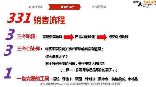 “331销售流程” 01 课程回顾 02 销售流程 03 讲师总结 课程回顾 引言 整个销售过程就是一个展示、证明、体验的过程;整个销售过程就是工具应用的过程;整个销售过程就是掌控客户的过程;整个销售过程就是不断强化促成的过程。客户消费的心理20%是由理性分析的,80%是由感性决定的。消费者购买一件商品有证明的不一定相信,但是没有证明一定不会相信。寒暄赞美 观点:人向他 喜欢 且 信任 的人买东西 喜欢:要想赢得客户的喜欢我们也真诚的喜欢客户所喜欢的人和物 信任:要赢得客户的信任,我们要不断的和客户交往,要以诚相待 你买不买没有关系,你听我讲的有没有道理找适当的机会切入保险话题 产品说明 观点:不单单讲产品的性质和功能,更要讲客户拥有产品的感觉 你今年多大了?(目的:让客户试穿衣服) 拿出计划书或是填好的投保单(通过大量的二择一问话来锁定他意愿) 促 成 用工具:笑脸报纸、荣誉客户,小礼品、等全力促成 拿出计划书说:这是我给××客户设计的10万的保额,您看,您是办10万呢?还是办5万呢?您看受益人是写您呢还是您的丈夫(妻子) 话术: 王姐,有个好消息告诉您,这个月我们公司刚上市一款巨无霸全能型产品,一张保单解决所有人生问题。您看《人民日报》也刊登了“xx”上市的消息。它是党和政府的报纸、党和政府是这么看待我们这个产品的,我们领导、政府说了都不算,老百姓说了才算。(拿出报纸) 接触工具:报纸、评鉴卡 流 程:讲《人民日报》报纸 讲评鉴活动 讲产品