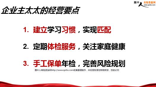 企业主太太经营 第一部分 企业主太太的特征分析 比较低调,性格一般不张扬(博士语录:名表、座驾体现高净值)朋友不多,圈子窄,不轻易吐露心声(利益关系朋友很多,但走进内心的朋友很少)一旦建立信任后,依赖性很强(耐住时间的考验,真心和真诚打动客户,绝对不要功利) 1.性格特征 喜欢健康,喜欢养生追求提升气质,喜欢美容,SPA 喜欢外出旅游,参加各种活动消费层次高,日常用品都是奢侈品2.生活习惯 重视子女教育,舍得付出,送孩子上最好的私立或国际学校,希望子女将来有能力,生活富足自己愿意学习,希望与时俱进,希望和先生有沟通话题,能做好贤内助(不想与社会脱节,在企业上可以帮助老公,给孩子好的规划) 3.教育观念 懂得经营企业的不容易,也会做一些投资,希望通过自己的努力体现自己的能力,证明自己(做母亲的价值,爱人前面努力,自己守护家人的财富传承,保证未来生活的品质)缺乏安全感,对未来有担忧,希望资产得到保护、积累同时传承下去(他们不关心保险带来多少利益,只关心今天放在保险公司的钱,未来是确定的) 4.生存危机 第二部分 企业主太太的经营要点 企业主太太的经营要点 建立学习习惯,实现匹配定期体检服务,关注家庭健康手工保单年检,完善风险规划 1.建立学习习惯实现匹配 邀请她们不断学习,培养观念与时俱进当前热点实事 例如《民法典》《CRS新政》《婚姻法》《合同法》… 家庭资产传承方面 例如《企业所得税》《遗产税》《房产税》《家庭资产合理配置》《融资投资》……. 通过学习搭建沟通桥梁,打开视界,增长客户见识,客户与我共成长