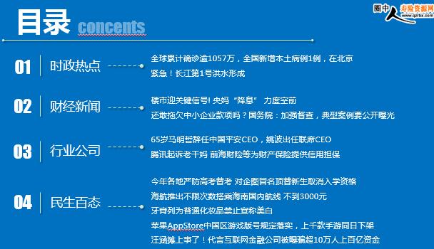 每日新闻速递 2020年7月3日 星期五 时政热点 财经新闻 行业公司 民生百态 全球累计确诊逾1057万,全国新增本土病例1例,在北京 紧急!长江第1号洪水形成 楼市迎关键信号! 央妈“降息” 力度空前 还敢拖欠中小企业款项吗?国务院:加强督查,典型案例要公开曝光 65岁马明哲辞任中国平安CEO,姚波出任联席CEO 腾讯起诉老干妈 前海财险等为财产保险提供信用担保 今年各地严防高考替考 对企图冒名顶替新生取消入学资格 海航推出不限次数搭乘海南国内航线 不到3000元 牙膏列为普通化妆品禁止宣称美白 苹果AppStore中国区游戏版号规定落实,上千款手游同日下架 汪涵摊上事了!代言互联网金融公司被曝骗超10万人上百亿资金 时政热点 全球累计确诊逾1057万,全国新增本土病例1例,在北京 2020-07-02 13:20 来源:澎湃新闻 据美国约翰斯·霍普金斯大学实时统计数据,截至北京时间7月2日1时34分,全球新冠肺炎确诊病例累计10,538,577例,死亡512,689例。 7月1日0—24时,31个省(自治区、直辖市)和新疆生产建设兵团报告新增确诊病例3例,其中境外输入病例2例(上海1例,广东1例),本土病例1例(在北京);无新增死亡病例;无新增疑似病例。 紧急!长江第1号洪水形成 2020-07-02 13:28 来源:中国经济网 近日,受强降雨影响,长江上游干流、乌江及三峡区间来水明显增加。受上述来水影响,三峡水库来水快速增加,7月2日10时入库流量涨至50000立方米每秒,根据《全国主要江河洪水编号规定》,达到洪水编号标准,“长江2020年第1号洪水”在长江上游形成。 ...........