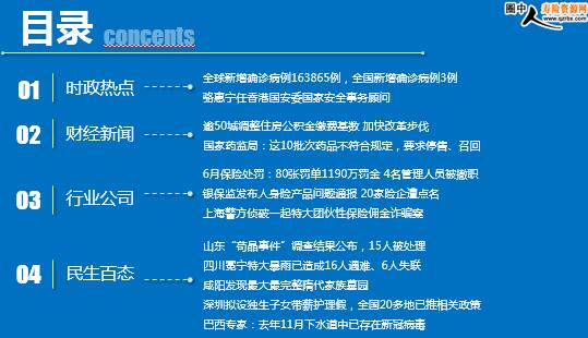 每日新闻速递 2020年7月4日 星期六 目录 时政热点 财经新闻 行业公司 民生百态 全球新增确诊病例163865例,全国新增确诊病例3例 骆惠宁任香港国安委国家安全事务顾问 逾50城调整住房公积金缴费基数 加快改革步伐 国家药监局:这10批次药品不符合规定,要求停售、召回 6月保险处罚:80张罚单1190万罚金 4名管理人员被撤职 银保监发布人身险产品问题通报 20家险企遭点名 上海警方侦破一起特大团伙性保险佣金诈骗案 山东“苟晶事件”调查结果公布,15人被处理 四川冕宁特大暴雨已造成16人遇难、6人失联 咸阳发现最大最完整隋代家族墓园 深圳拟设独生子女带薪护理假,全国20多地已推相关政策 巴西专家:去年11月下水道中已存在新冠病毒 时政热点 全球新增确诊病例163865例,全国新增确诊病例3例 2020-07-03 03:01 来源:澎湃新闻 截至欧洲中部时间6月30日10时(北京时间16时)全球范围内,新冠确诊病例较前一日增加163865例,达到10185374例;死亡病例较前一日增加3946例,达到503862例。 6月30日0—24时,31个省(自治区、直辖市)和新疆生产建设兵团报告新增确诊病例3例,均为本土病例(均在北京);无新增死亡病例;新增疑似病例2例,为境外输入病例(均在上海)。 骆惠宁任香港国安委国家安全事务顾问 2020-0依照《中华人民共和国香港特别行政区维护国家安全法》有关规定,国务院2020年7月3日决定,任命骆惠宁为香港特别行政区维护国家安全委员会国家安全事务顾问。 任命郑雁雄为中央人民政府驻香港特别行政区维护国家安全公署署长;任命李江舟、孙青野为中央人民政府驻香港特别行政区维护国家安全公署副署长。
